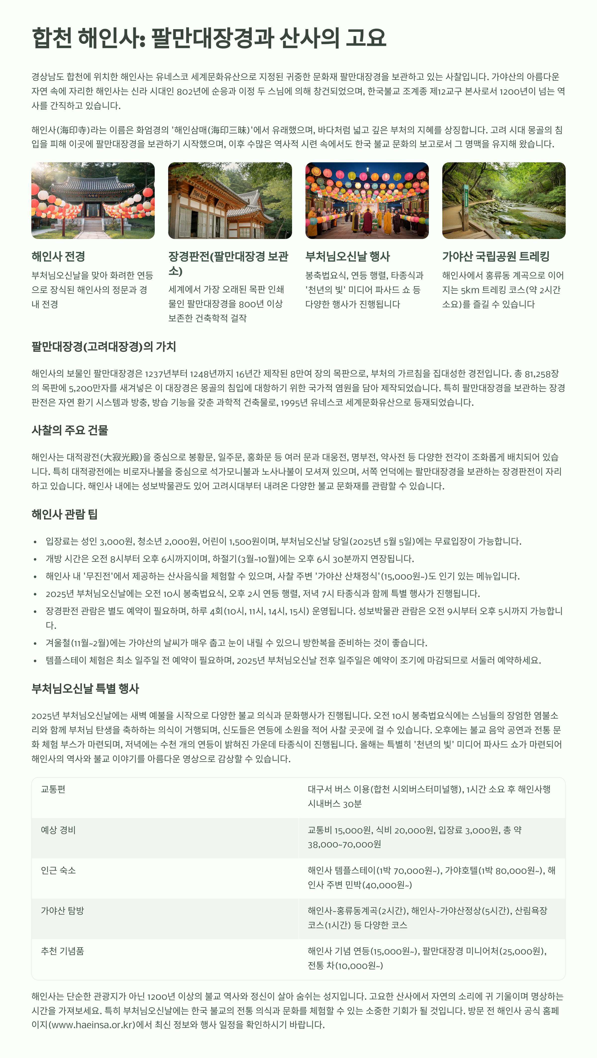 | 대구서 버스 이용, 1시간 소요 | 교통+식비 약 5~7만원 | 해인사 템플스테이 가능, 가야호텔 |