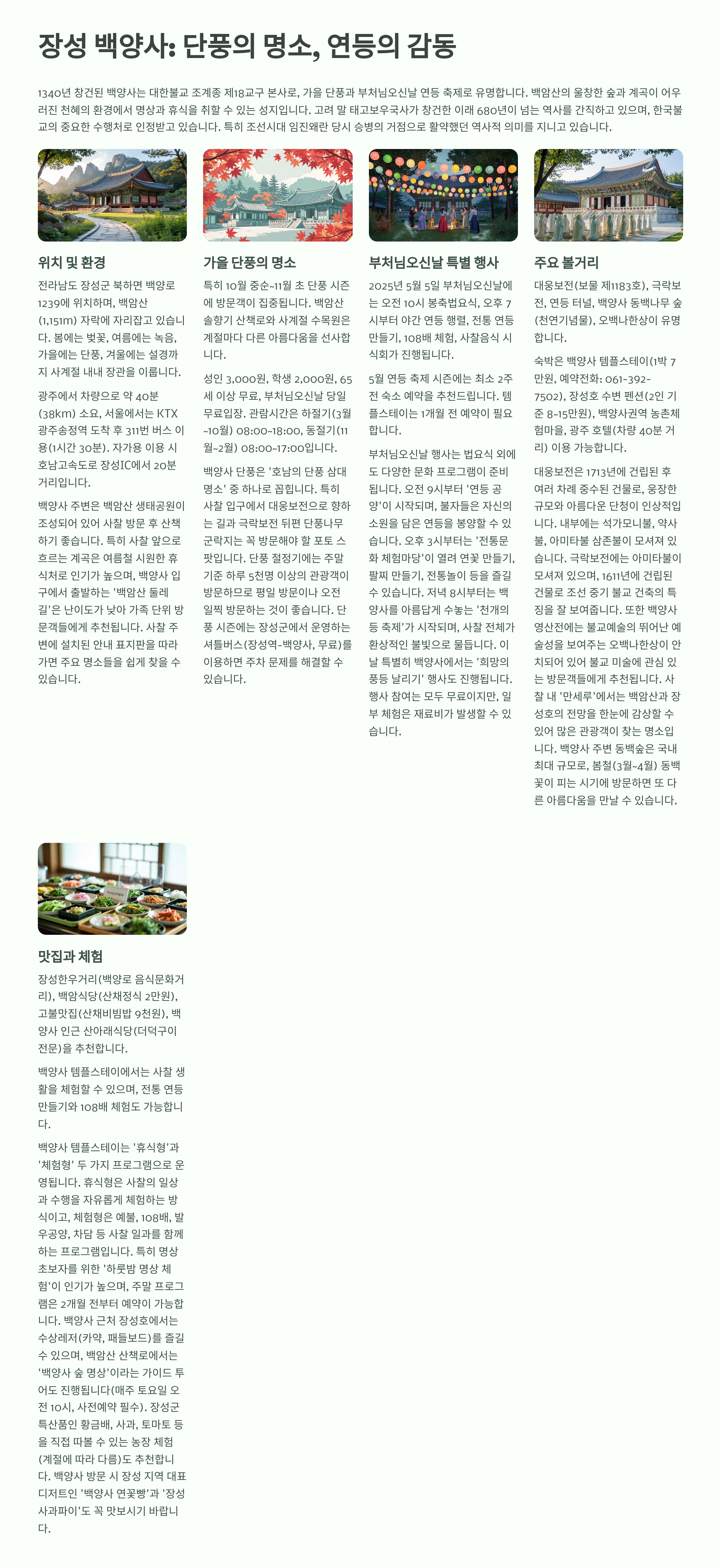 전라남도 장성 백암산 자락에 위치한 백양사는 사계절 아름다운 절경으로 유명하지만, 연등이 걸린 부처님 오신 날의 풍경은 더욱 감동적이에요. 수려한 산세와 고즈넉한 사찰이 어우러져 마음의 안정을 주는 곳이랍니다.