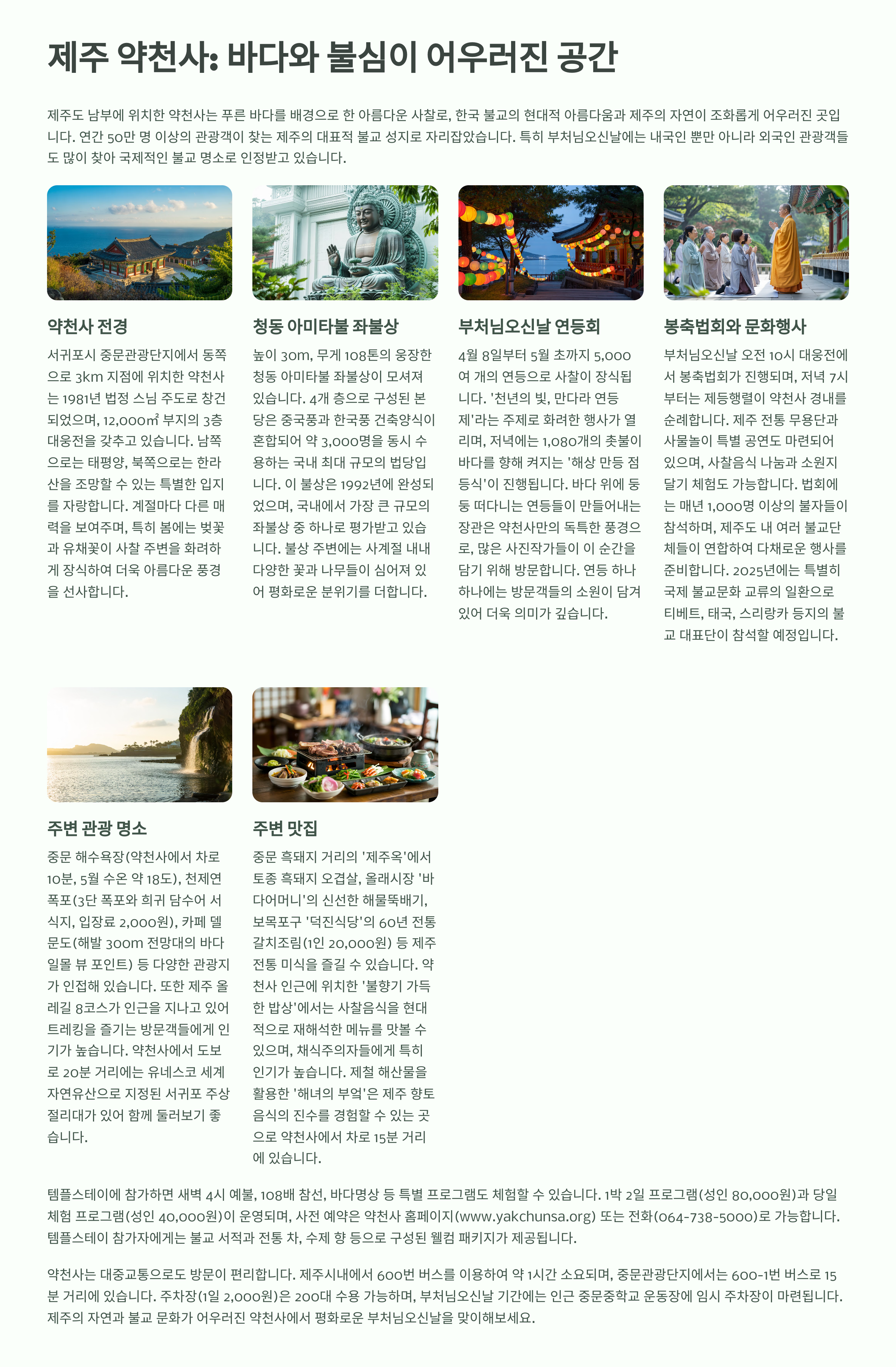 서울, 경기, 강원, 경상, 전라, 제주까지 전국을 대표하는 사찰들과 함께 교통편, 경비, 인근 맛집, 숙소 정보까지 꼼꼼히 안내해 드릴게요. 제 경험과 최신 트렌드를 바탕으로 가성비 높고 감동적인 사찰 여행을 계획하실 수 있도록 도와드릴게요!