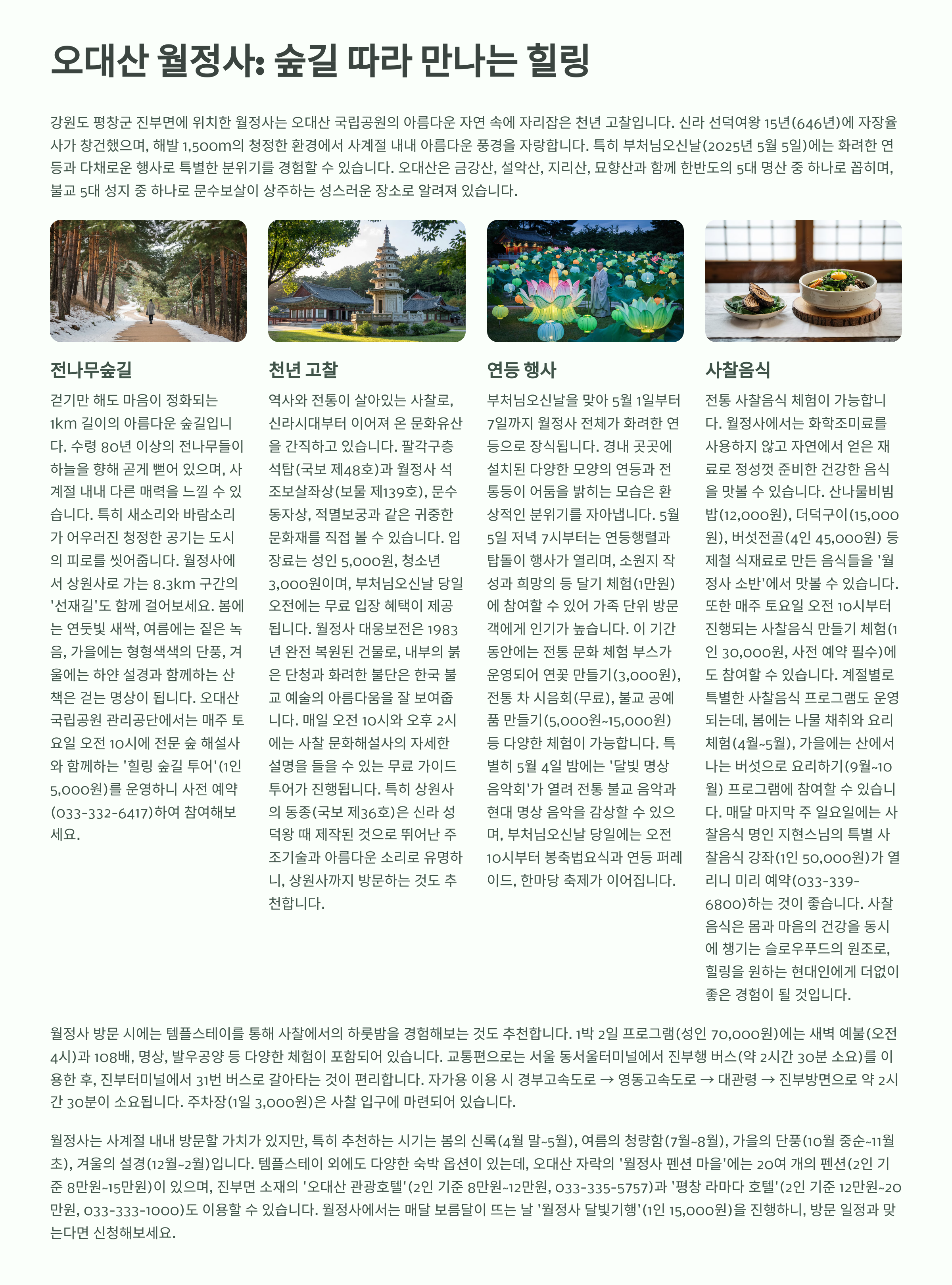 강원도 평창에 위치한 월정사는 천년 고찰의 풍모와 자연이 어우러진 힐링 사찰로, 오대천 따라 펼쳐진 전나무숲길이 유명합니다.