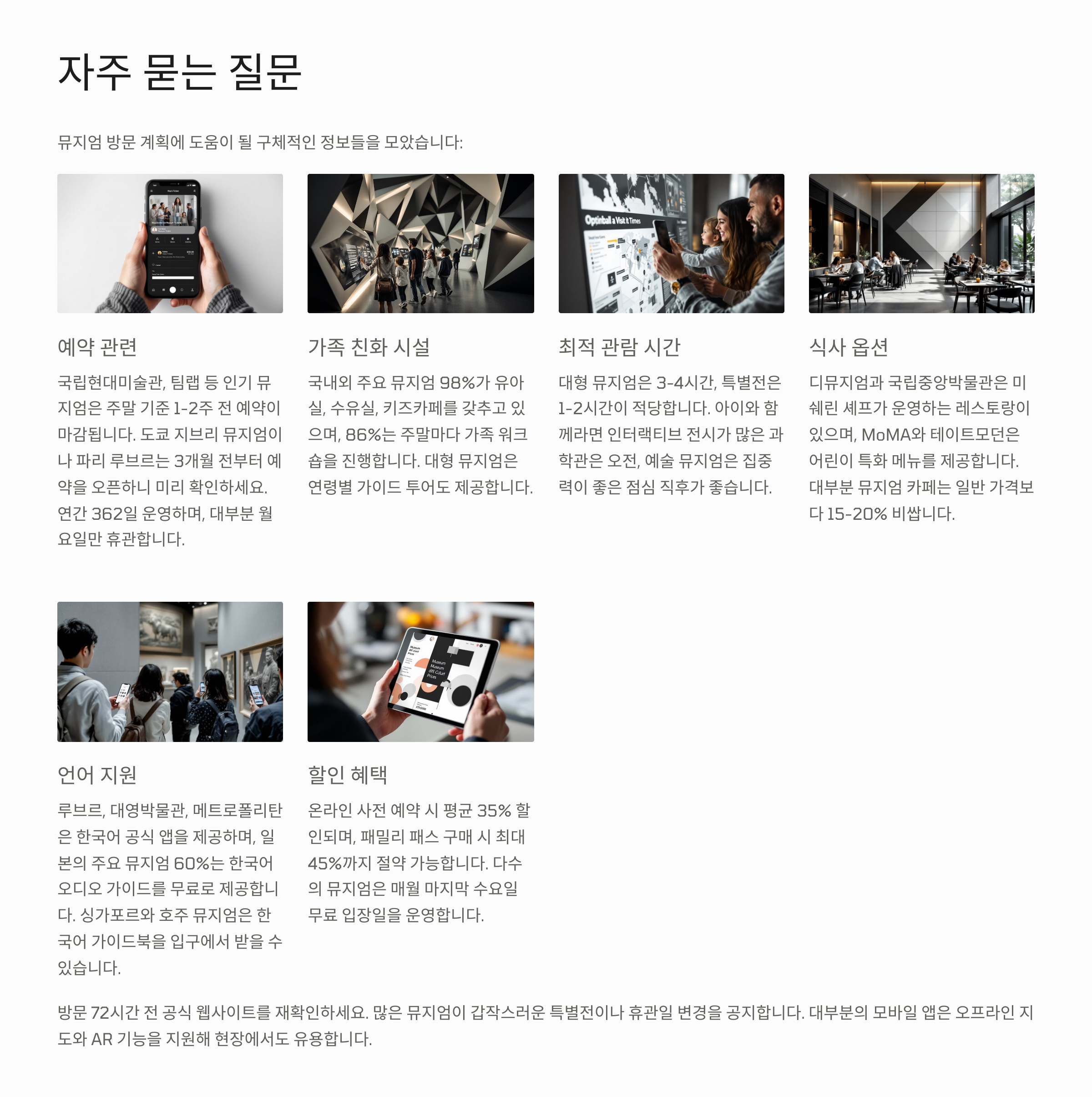 대부분의 뮤지엄은 아이들을 위한 별도 체험존이나 키즈 프로그램을 운영하고 있어 가족 단위 방문에 적합합니다.