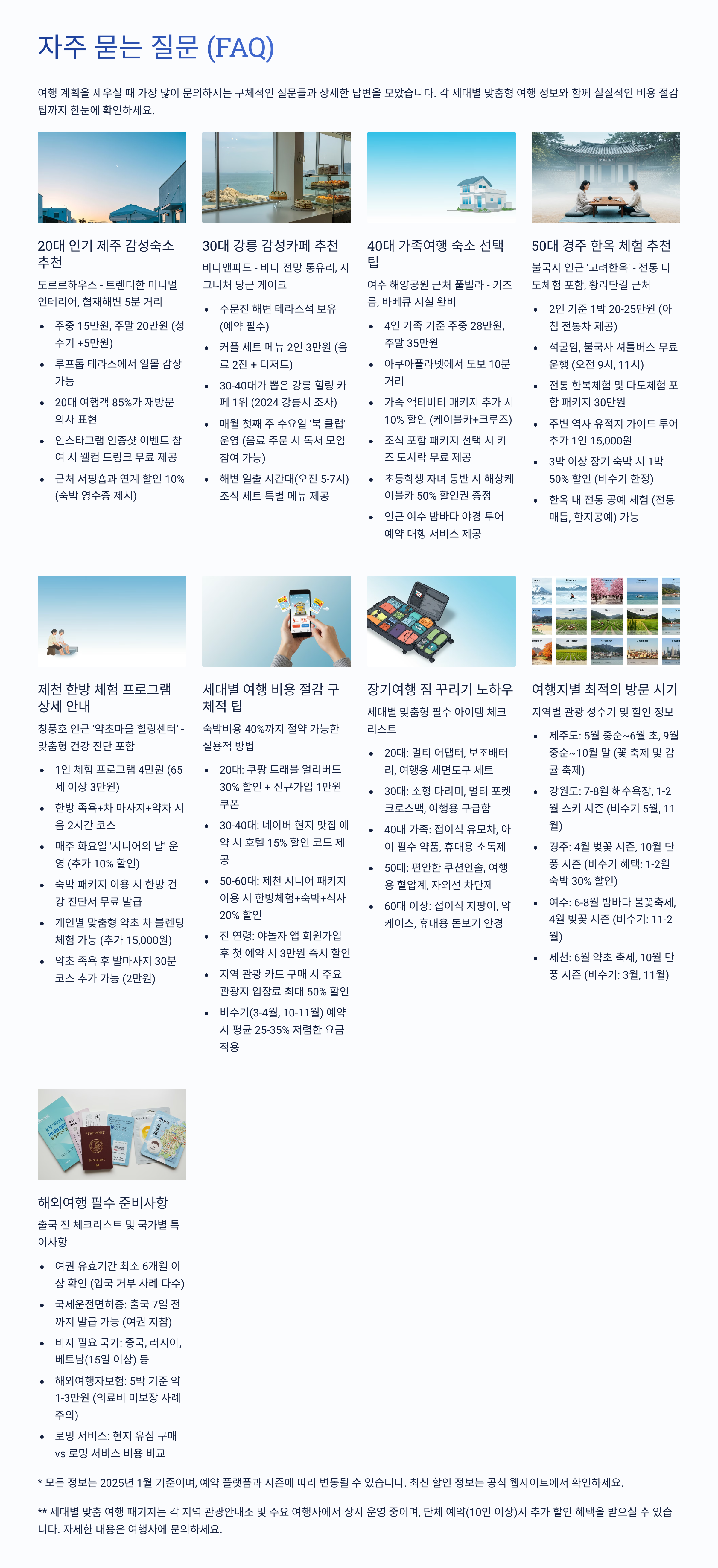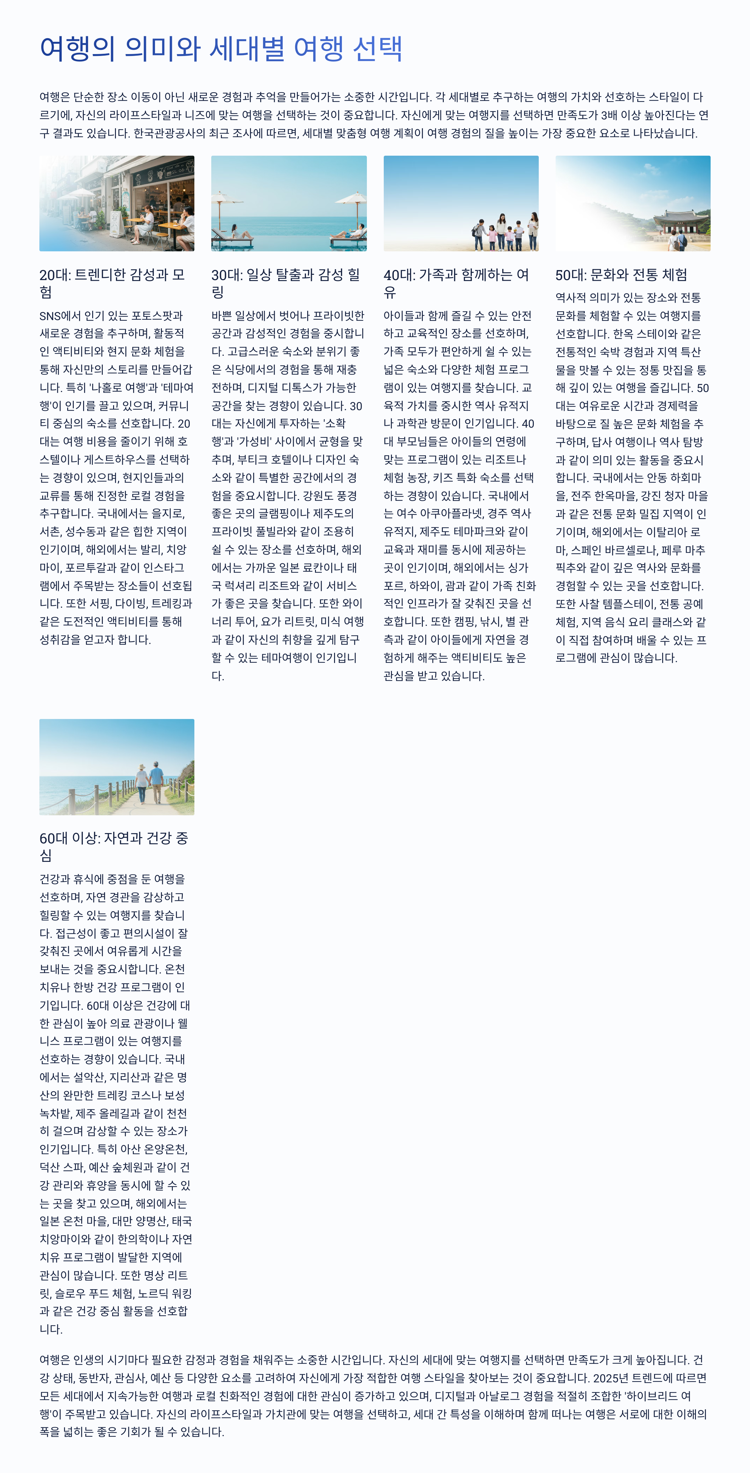 각 세대별로 다른 취향과 라이프스타일을 존중하면서, 나에게 딱 맞는 여행지를 선택해보세요.