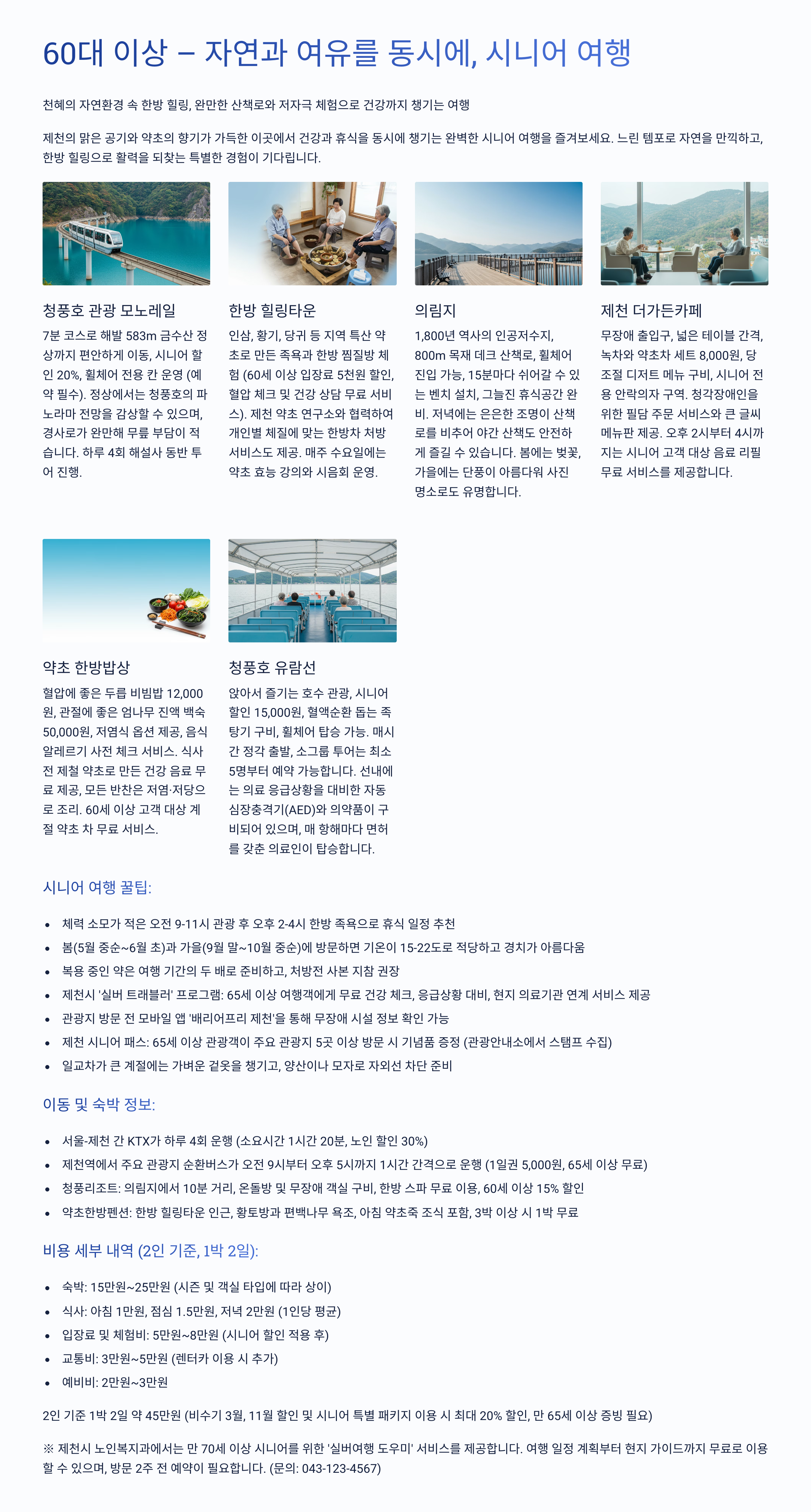 60대 이상 시니어 세대는 무리 없는 일정과 편안한 숙소, 자연 풍경이 잘 어우러진 여행지를 선호합니다. 충북 제천은 한방 힐링, 자연경관, 저자극 체험이 가능한 시니어 여행지로 각광받고 있어요. 특히 청풍호 관광 모노레일과 한방 힐링타운이 인기예요.