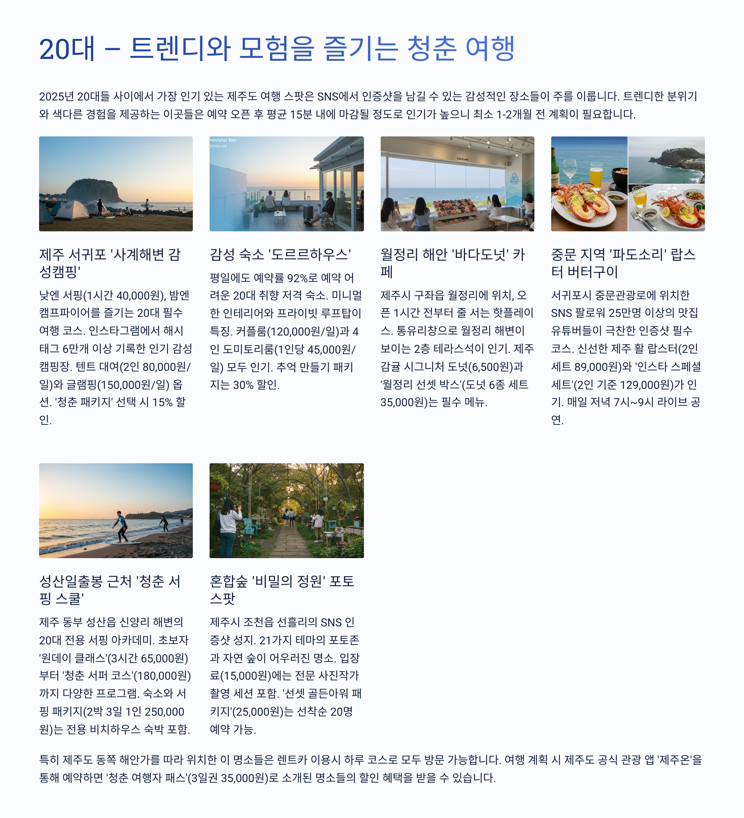 20대는 새로운 트렌드와 감성 스폿을 누구보다 빠르게 캐치하는 세대입니다. 2025년엔 제주 서귀포의 '사계해변 감성캠핑'이 큰 인기를 끌고 있습니다. 낮엔 서핑과 드라이브, 밤엔 캠프파이어와 감성 음악까지. SNS에서 핫한 감성 숙소인 ‘도르르하우스’는 평일에도 예약이 어려울 정도죠.