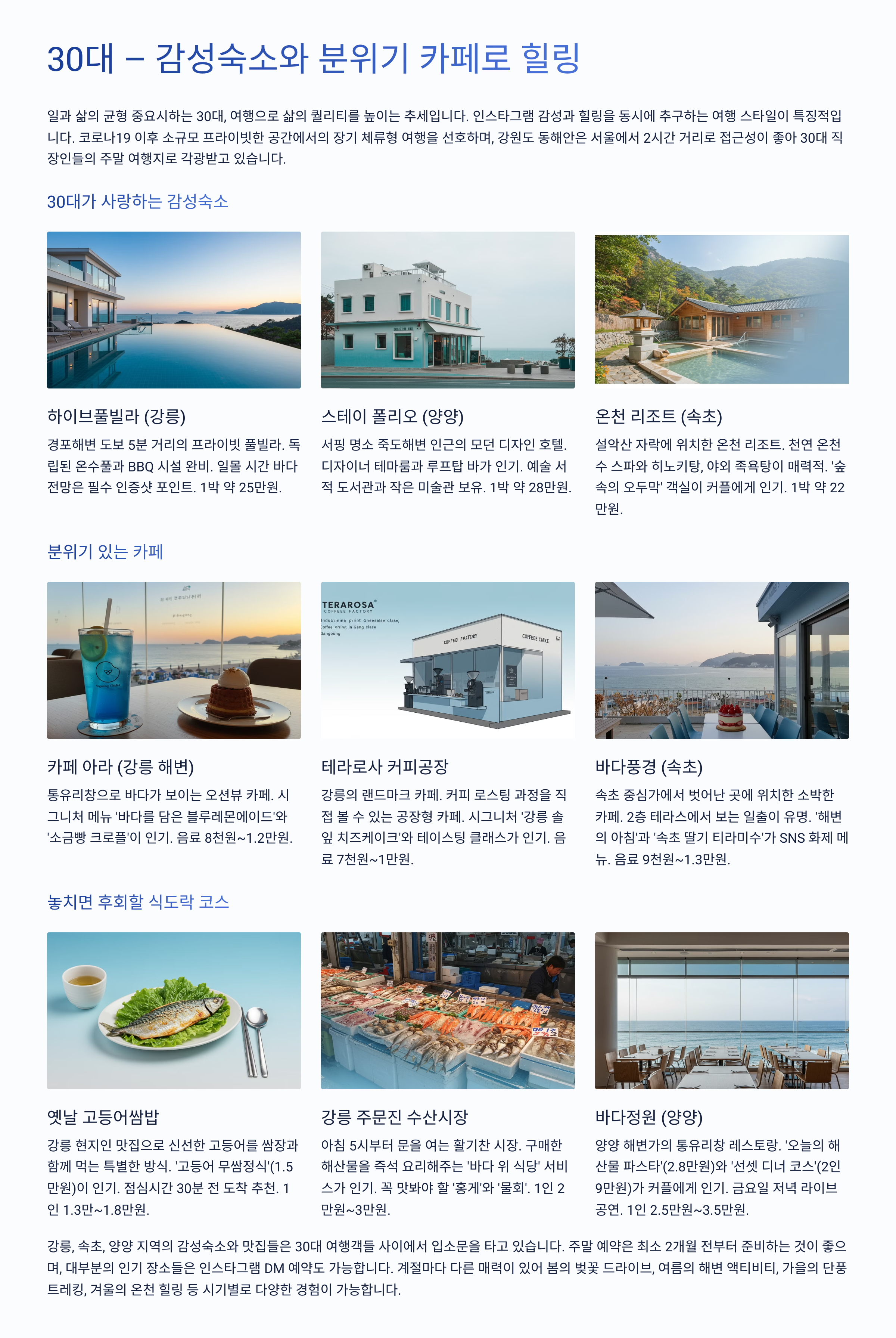 일과 삶의 균형을 중요시하는 30대는 감성을 자극하는 힐링 여행을 선호합니다. 2025년 상반기 기준으로 가장 핫한 지역은 강원도 강릉 경포대 근처입니다. 바다뷰가 아름다운 오션뷰 감성풀빌라 ‘하이브풀빌라’는 커플과 친구 여행객에게 특히 인기입니다.