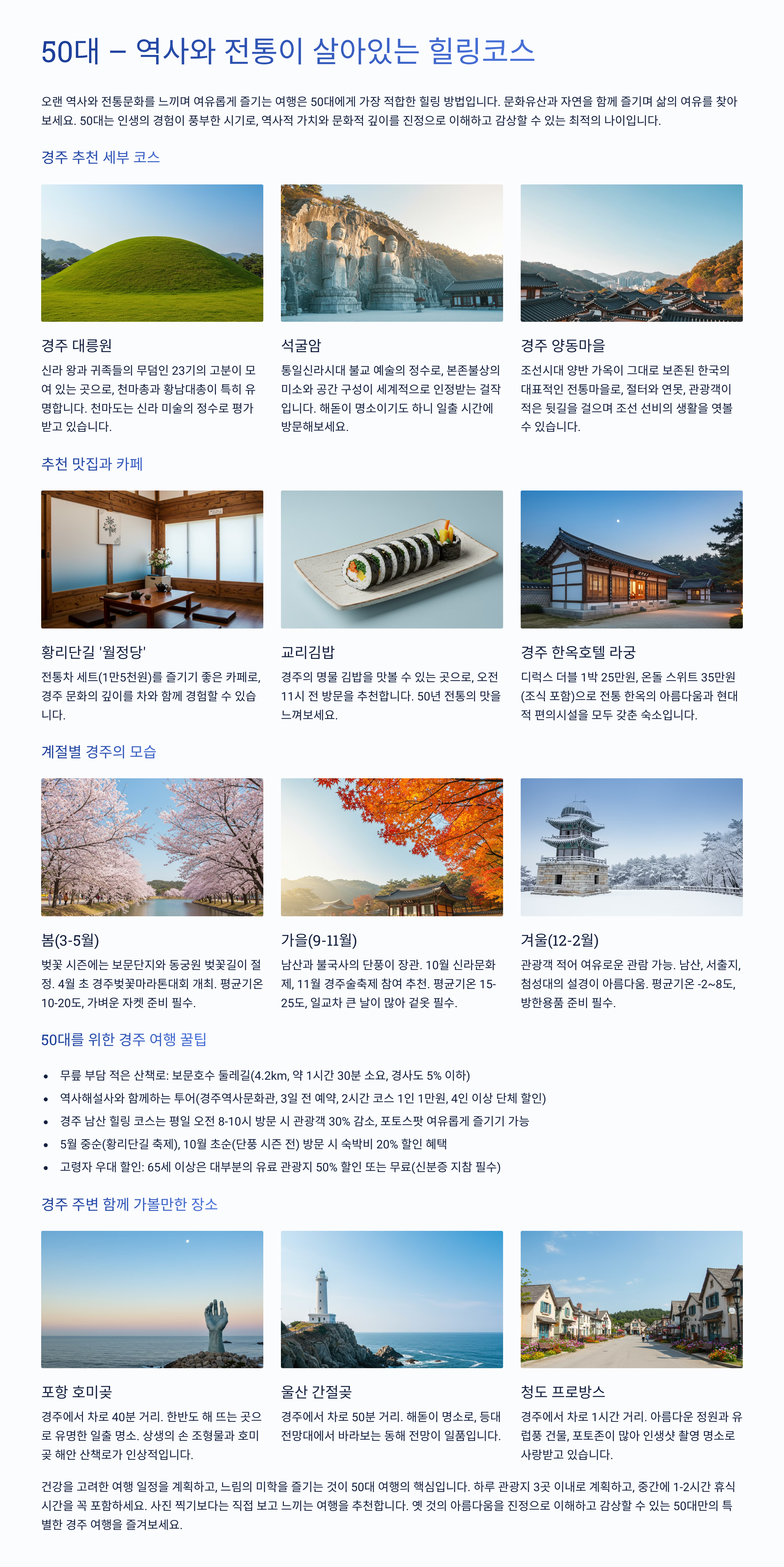 50대 여행자들은 문화적 가치와 휴식을 동시에 만족할 수 있는 여행을 선호합니다. 경주는 이러한 요구에 딱 맞는 곳입니다. 대릉원, 첨성대, 황리단길 등 유적지부터 감성 가득한 한옥 카페까지 하루가 모자라죠. 특히 봄과 가을의 경주는 자연과 전통의 조화가 아름답습니다.