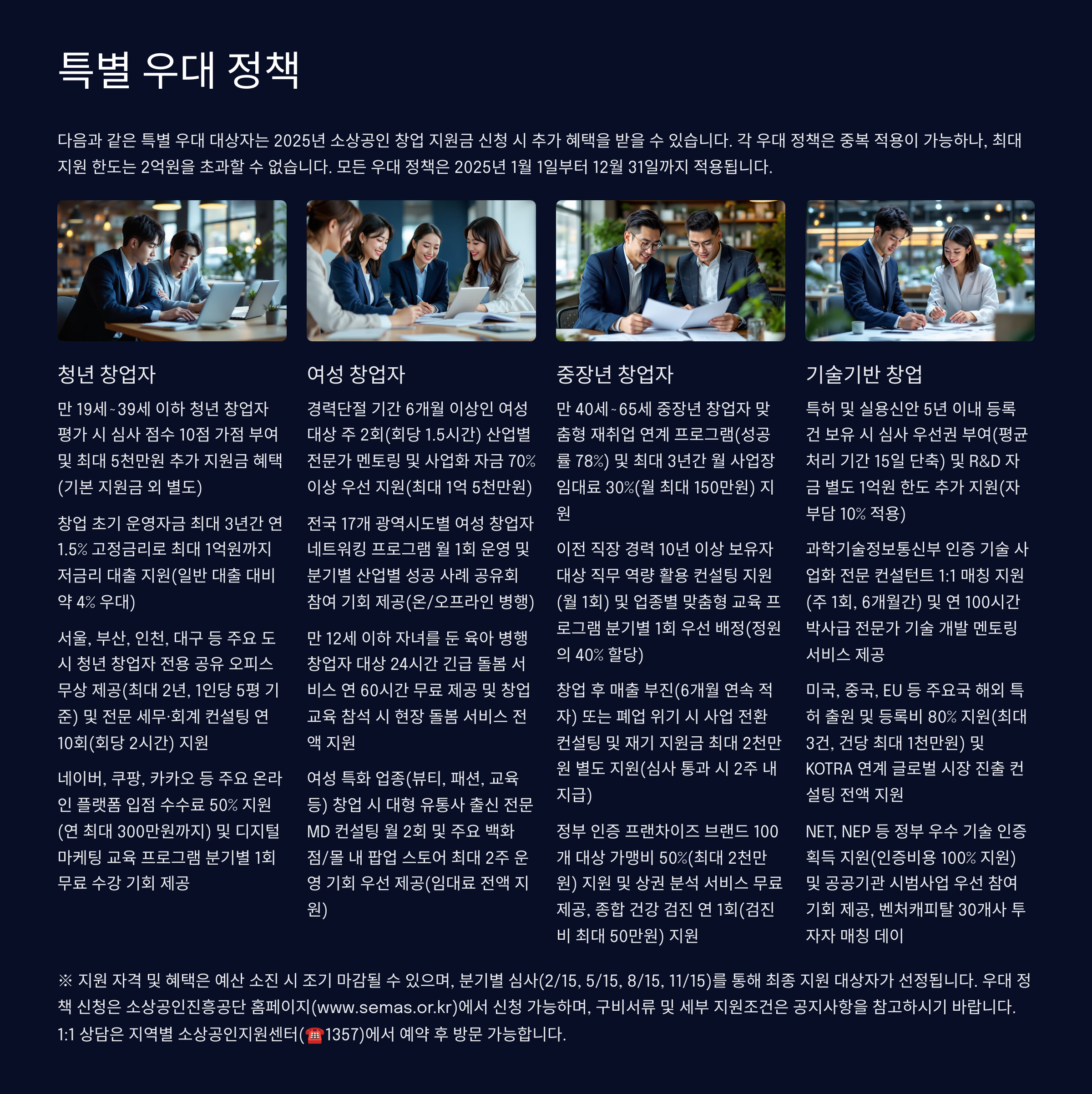 - 여성·중장년 창업자 우대정책: 경력단절 여성, 40~60대 중장년 창업자에게 별도 평가 가점 부여 및 멘토링, 사업화 지원 패키지 제공.