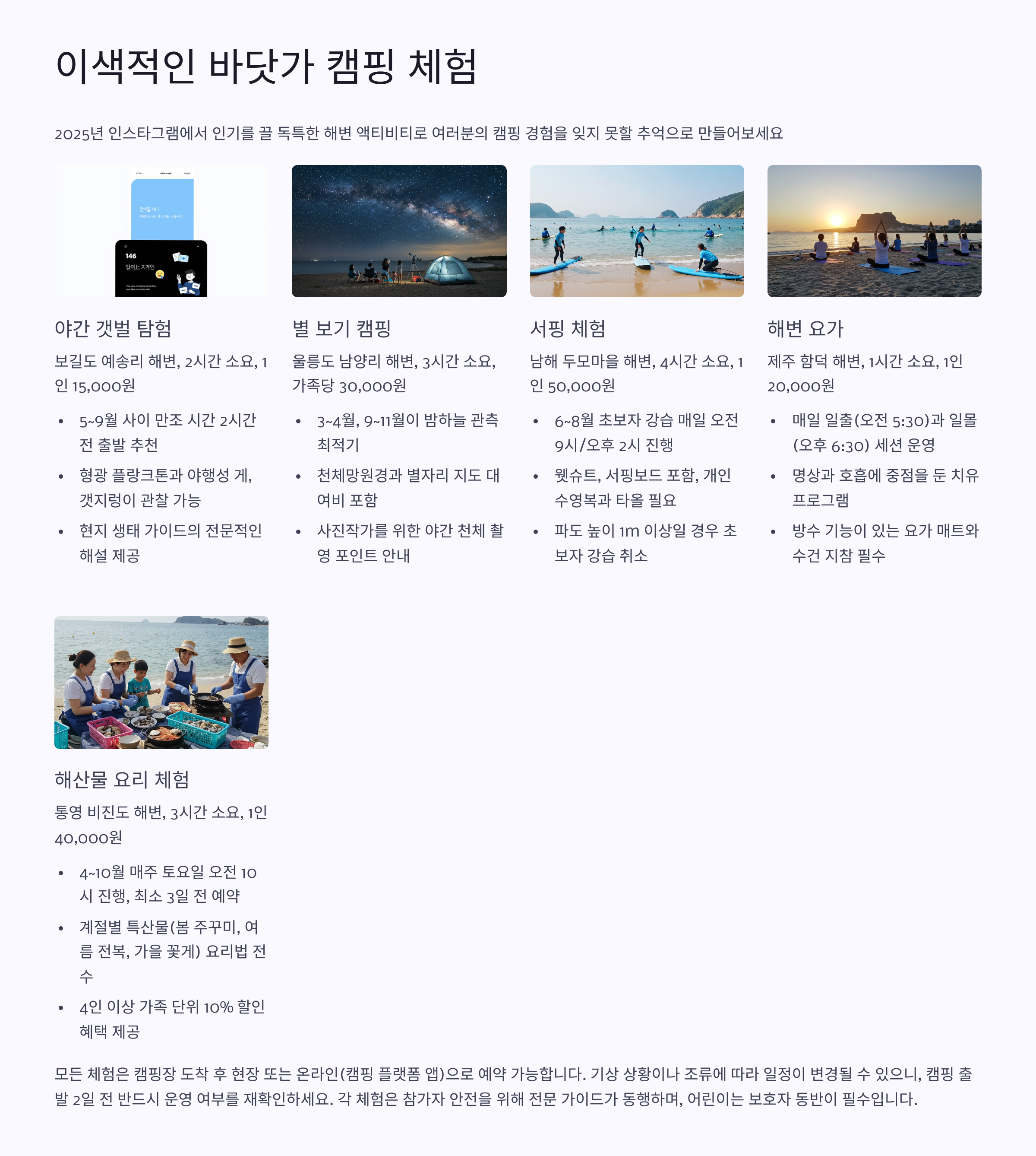 바닷가 캠핑에서는 단순한 숙박을 넘어 다양한 체험을 즐길 수 있습니다. 각 캠핑장에서 제공하는 특별한 체험을 정리했습니다.
