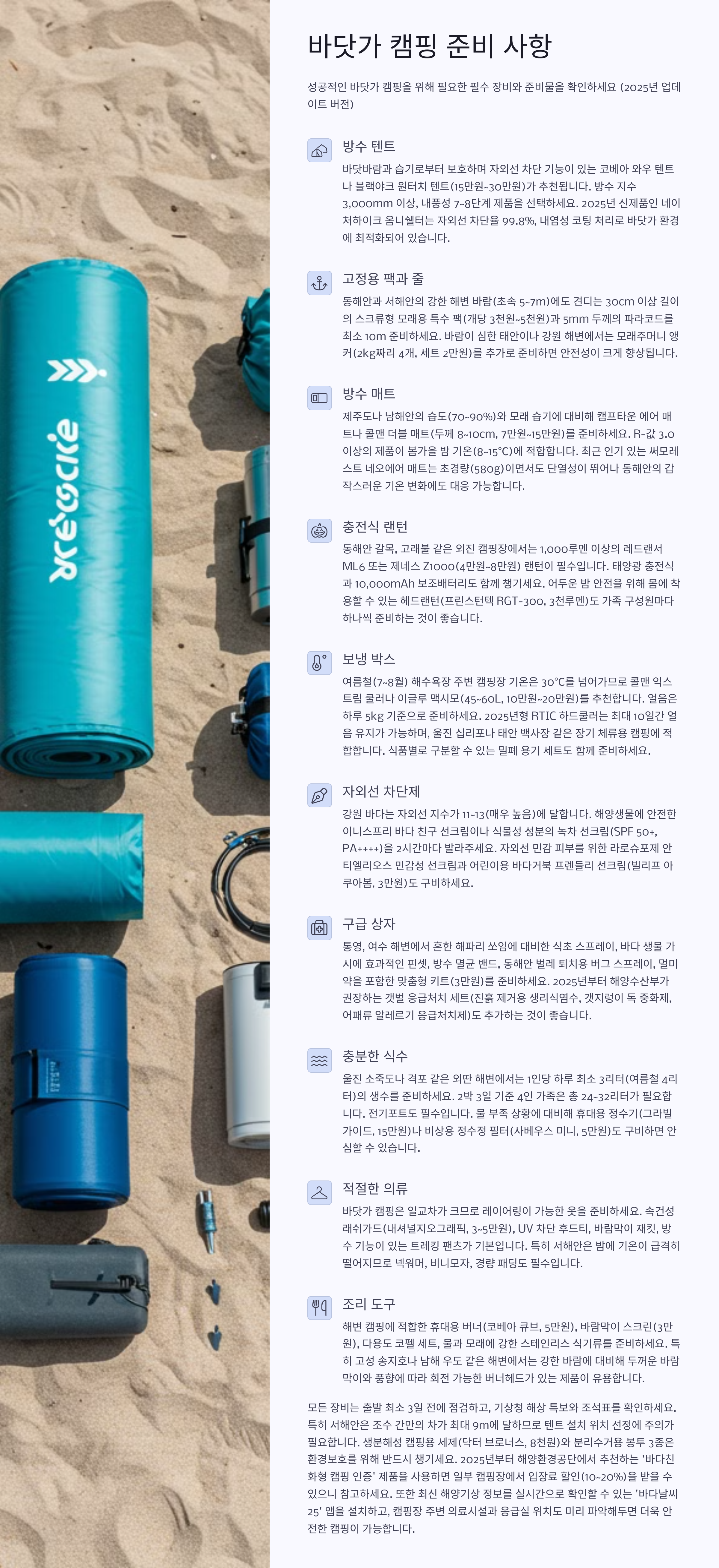 바닷가에서의 캠핑은 일반 캠핑과 다르게 바람, 습기, 모래 등을 고려해야 합니다. 따라서 철저한 준비가 필수입니다. 아래의 체크리스트를 참고하여 캠핑을 준비하세요.