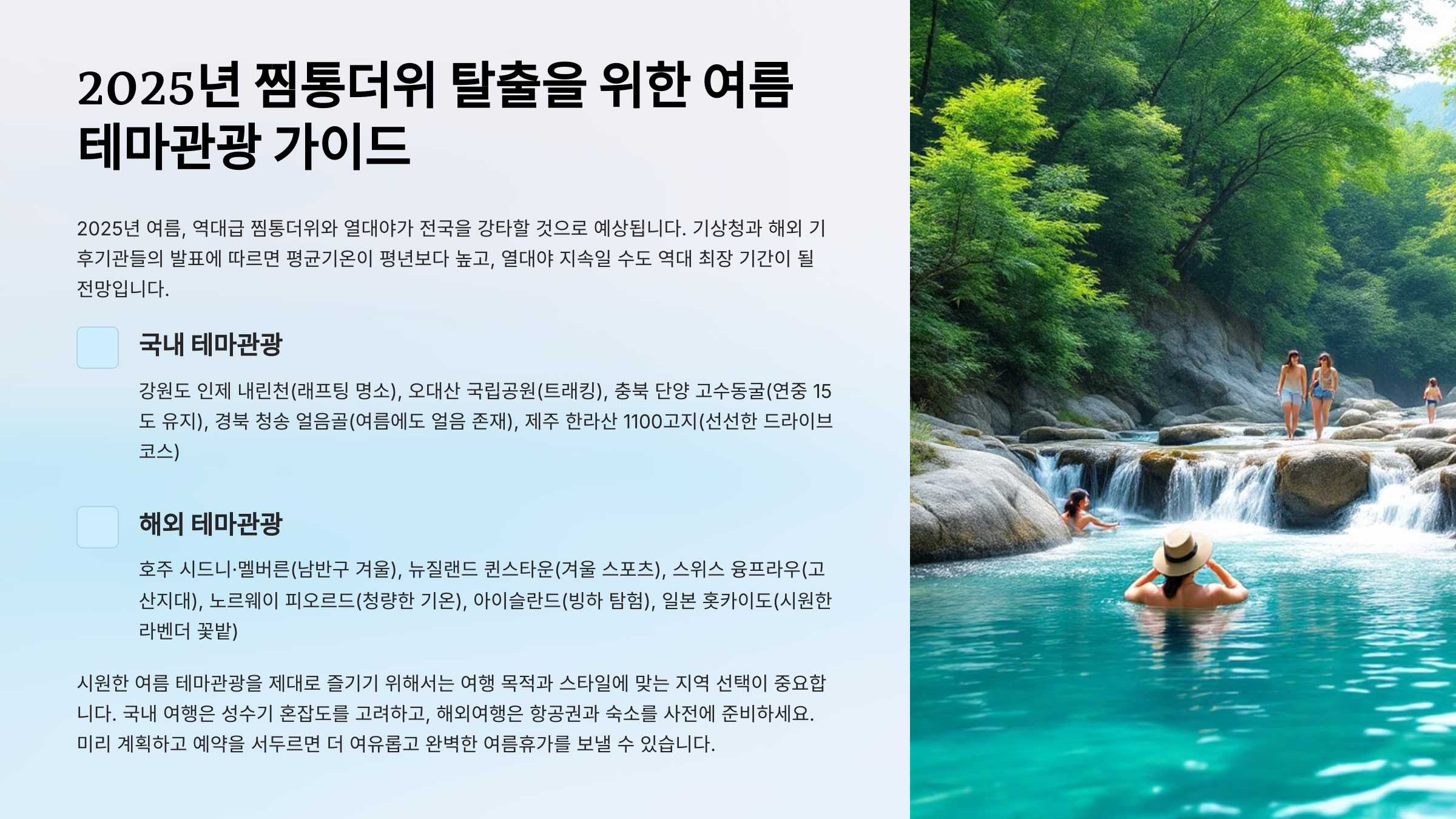 2025년 여름, 역대급 찜통더위와 열대야가 전국을 강타할 것으로 예상되면서 많은 사람들이 일상에서 벗어나 시원하게 더위를 피할 수 있는 여름 테마관광을 찾고 있습니다.