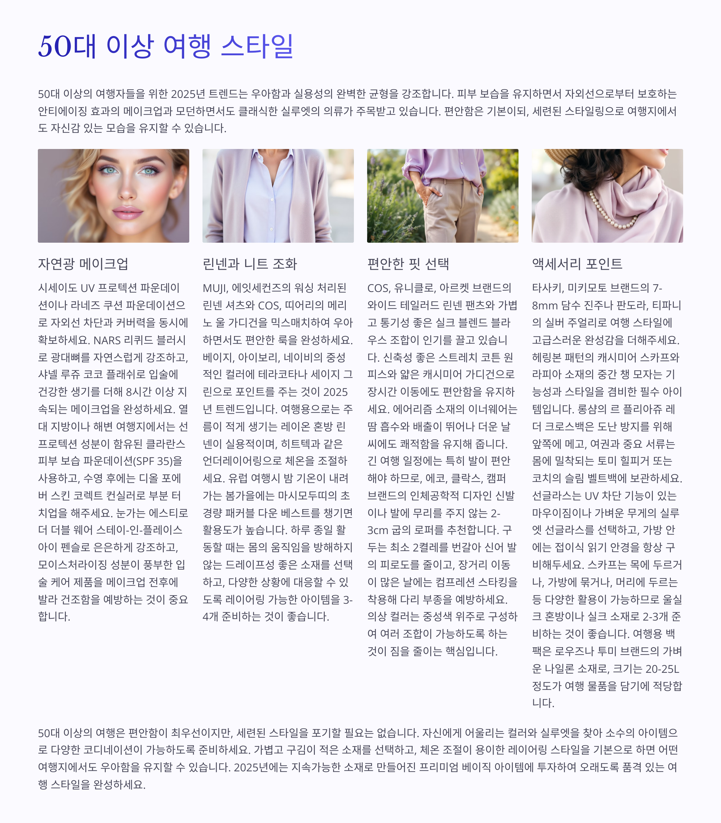 올해 여행을 계획 중이신 50대 이상 여성분들을 위한 특별한 스타일링 정보가 필요하신가요?