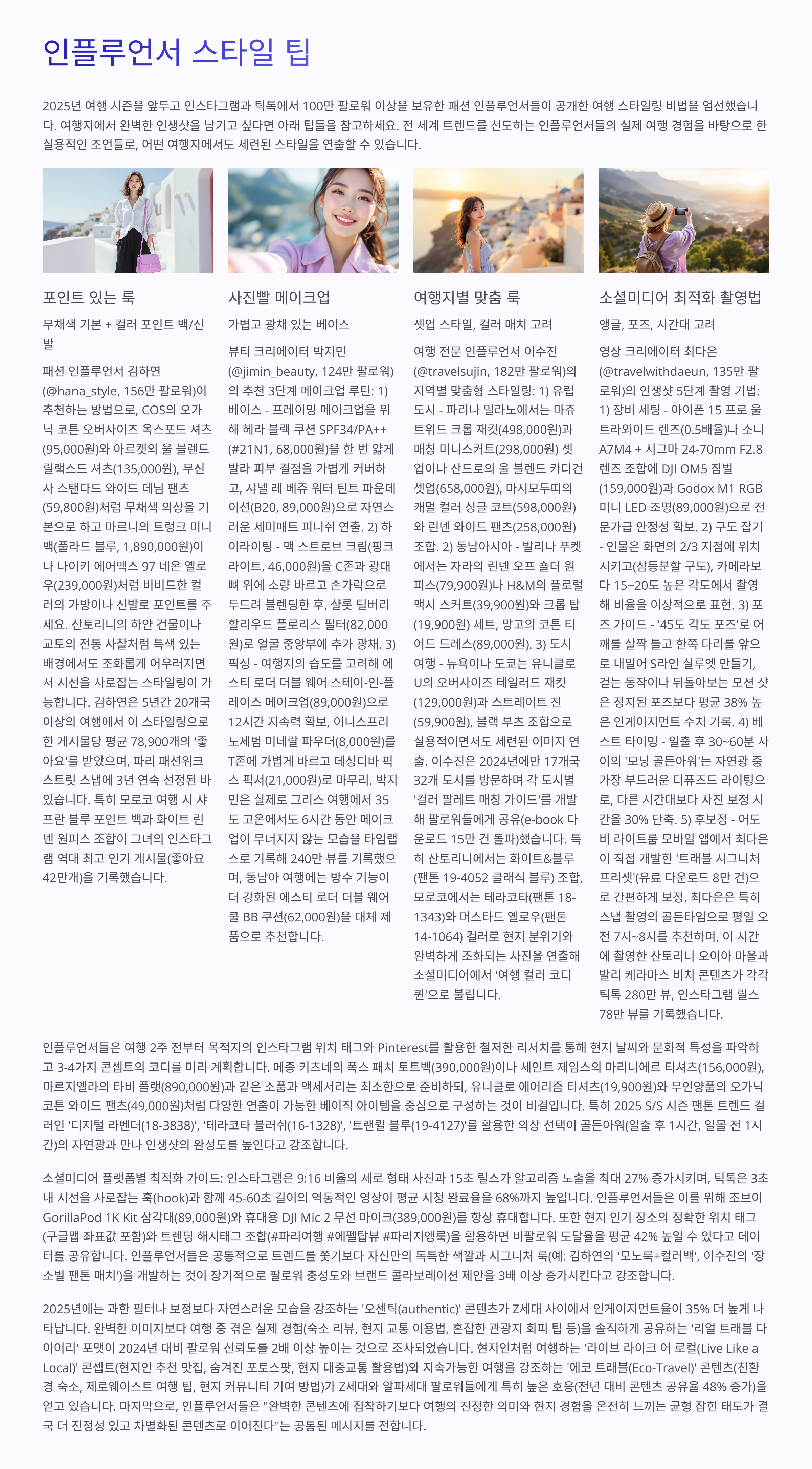 패션 인플루언서들은 여행지 특성에 맞춰 룩을 바꾸는 센스도 발휘하며, 메이크업은 무겁지 않으면서도 사진빨 받는 ‘광채 메이크업’이 자주 등장해요.