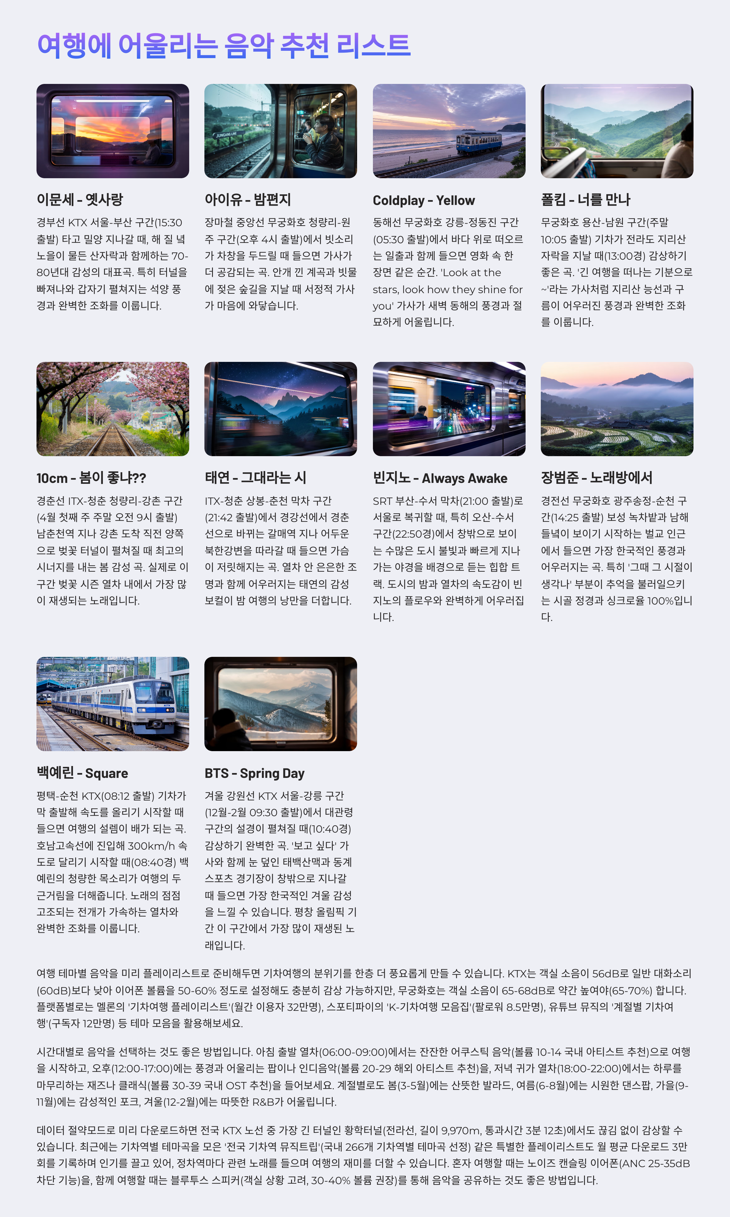 혹시 기차여행 중에 특별히 인상 깊었던 순간이나 꿀팁이 있다면 댓글로 남겨주실래요?