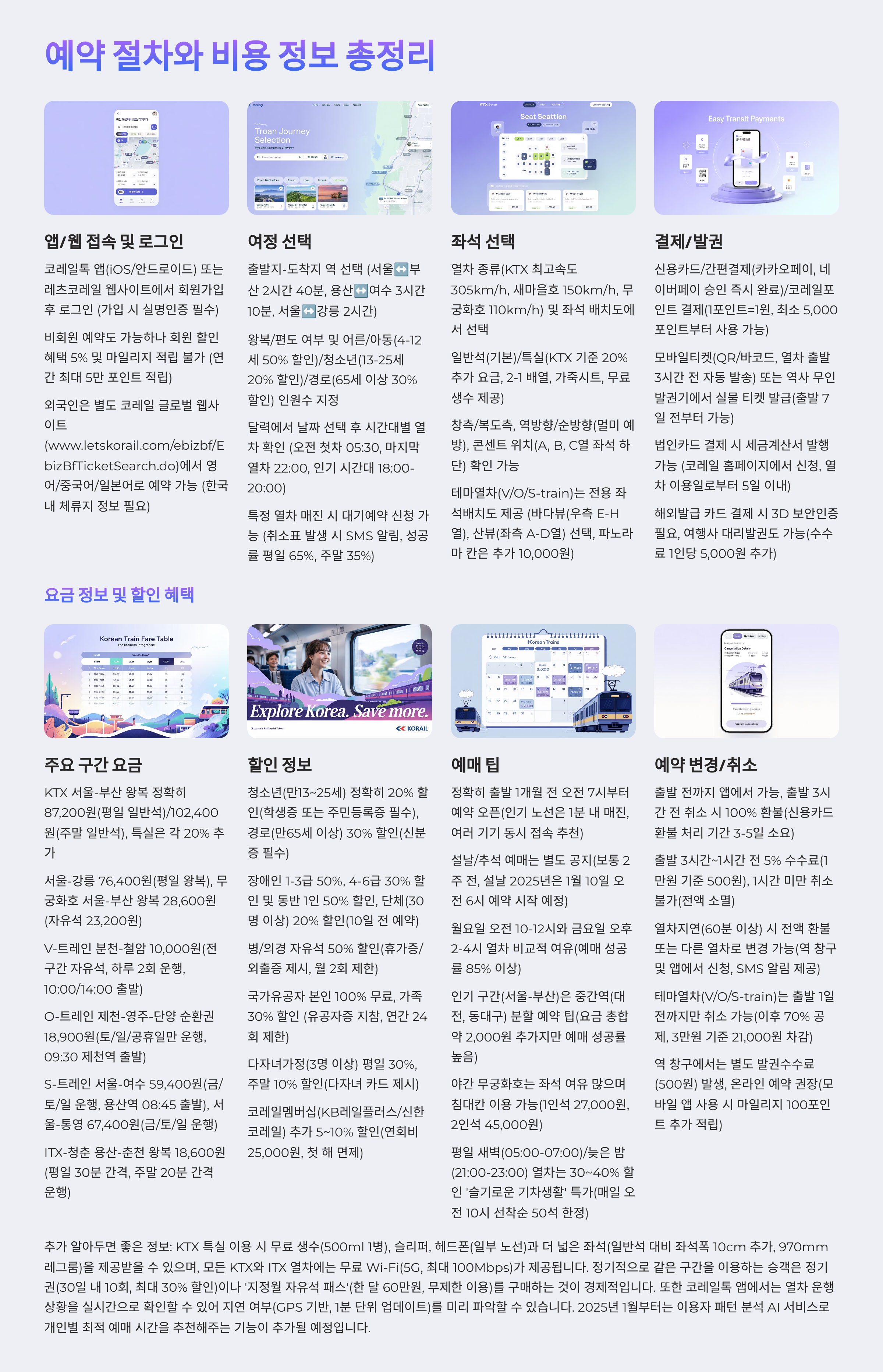 | KTX | 고속열차, 빠르고 쾌적함 | 시간 절약이 중요한 여행객 |