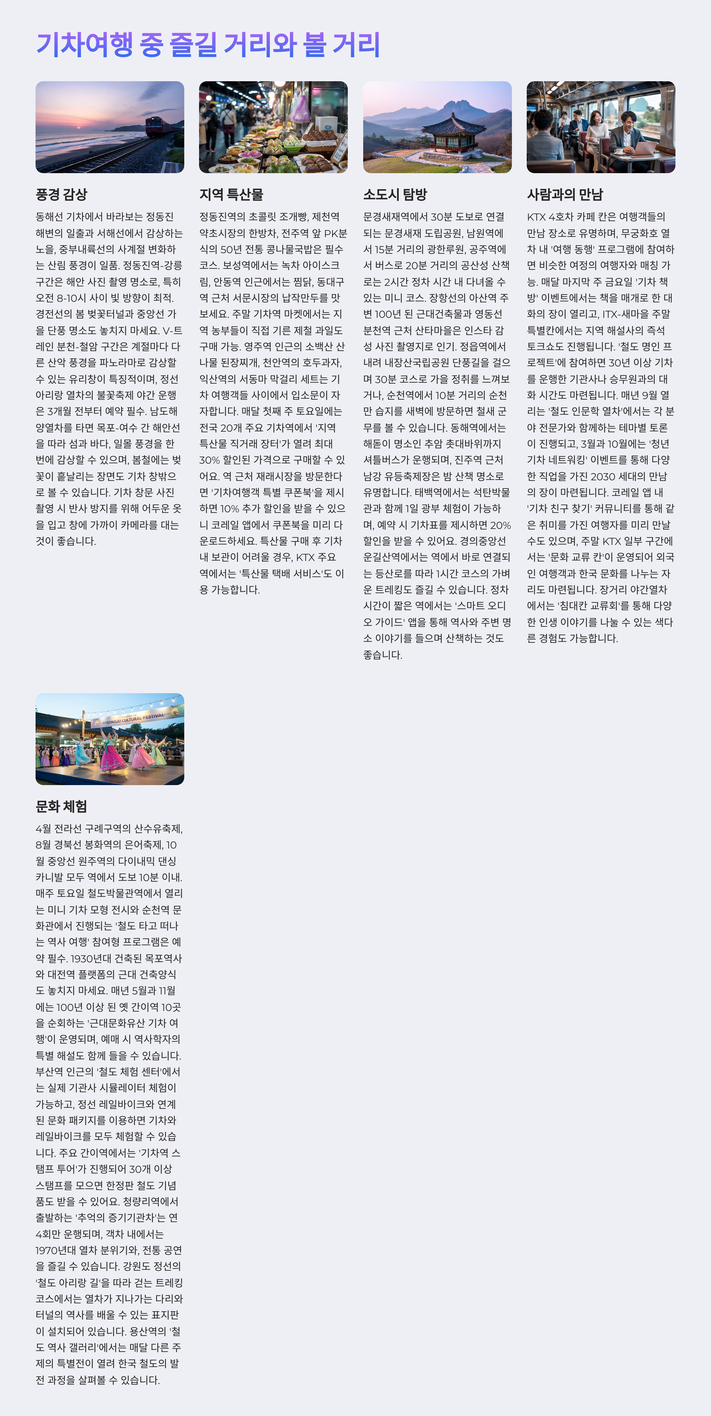 또 다른 인기 코스로는 강릉행 KTX, 남도 바다열차(목포-여수), 백두대간협곡열차(V-train)가 있어요.