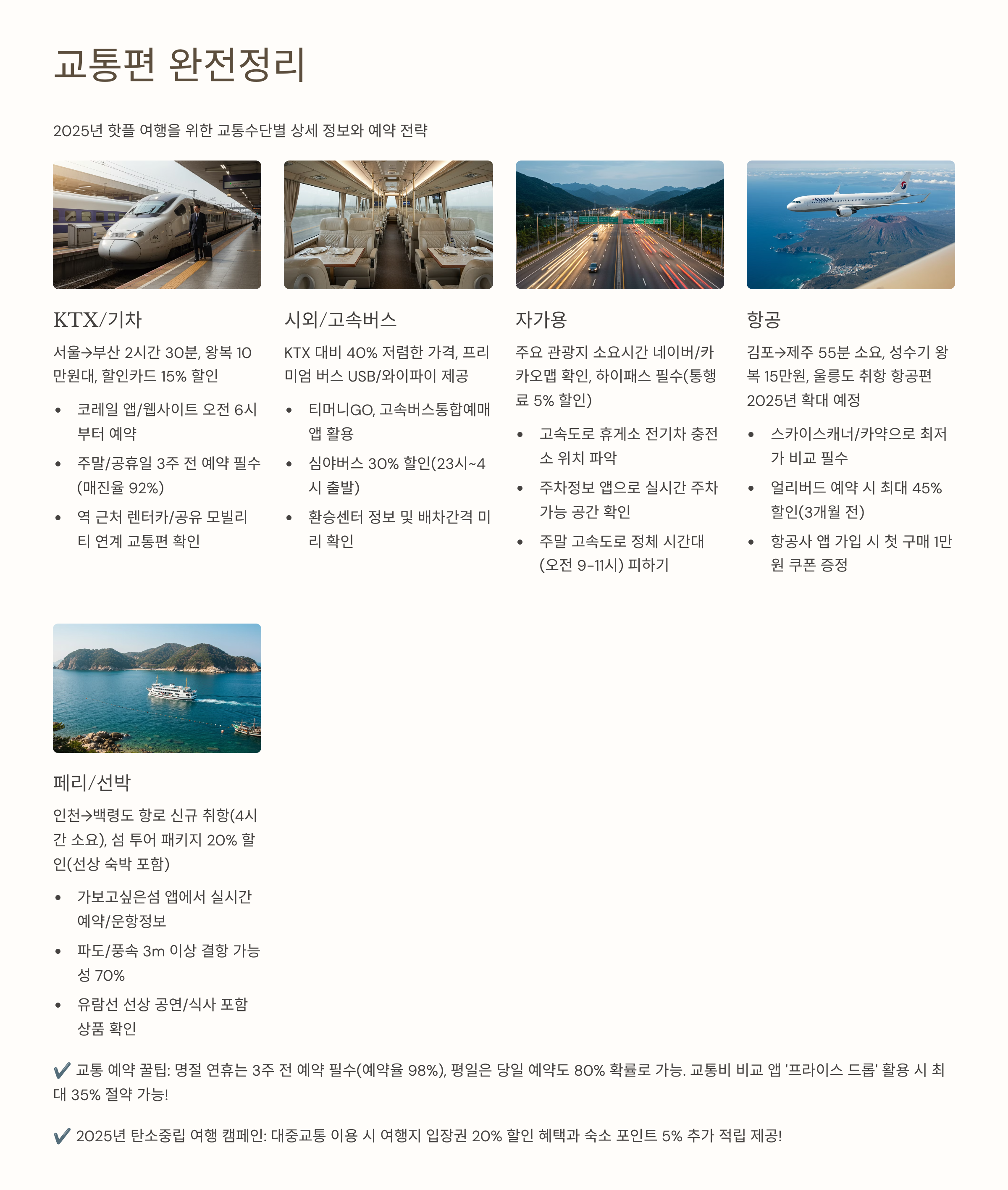- 🚄 KTX/기차: 빠르고 정시 도착률이 높지만 예약이 어렵고 가격이 다소 높음