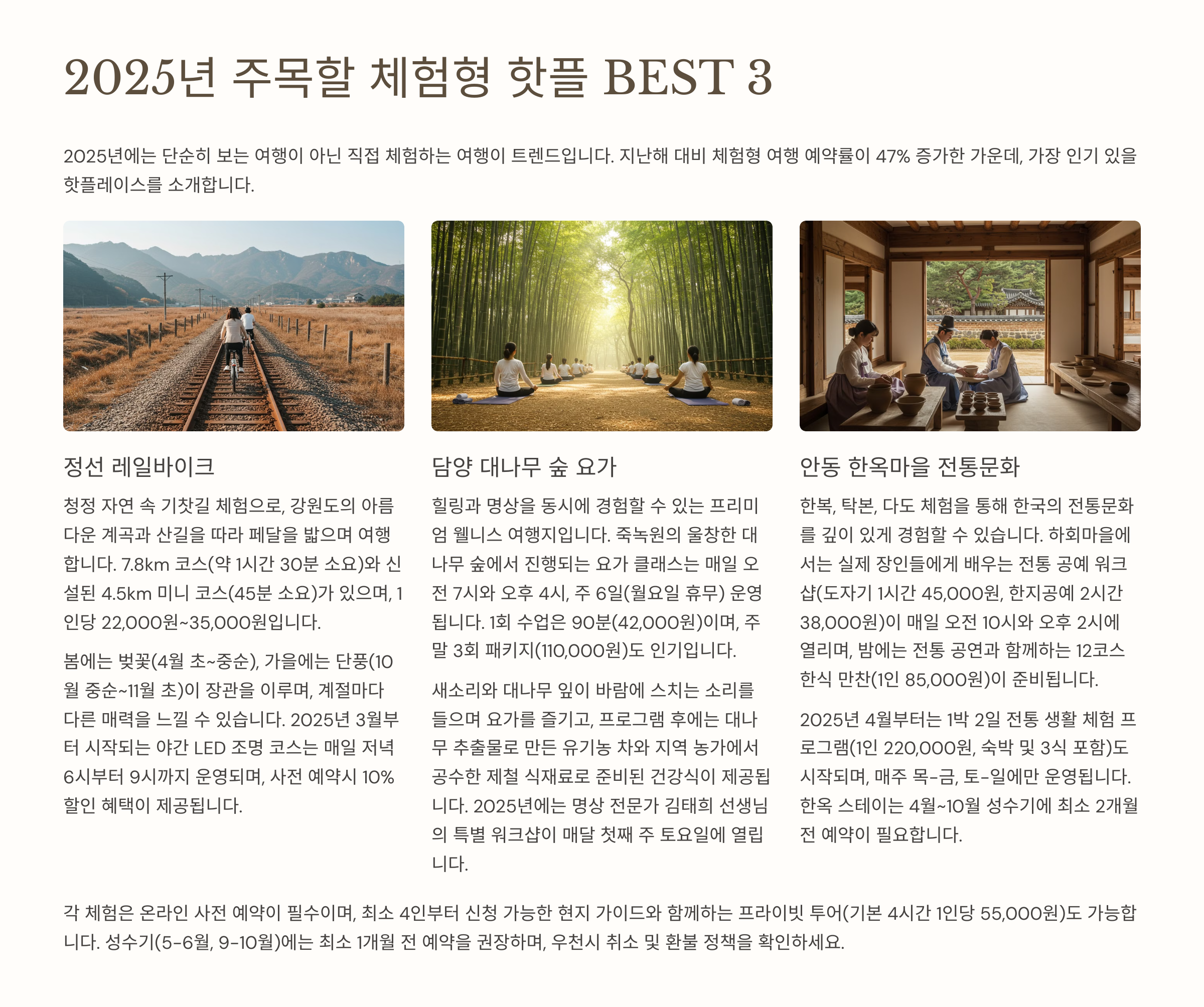 2025년 상반기 기준, SNS와 여행 플랫폼에서 가장 높은 리뷰와 추천을 받은 체험형 여행지는 세 곳입니다.