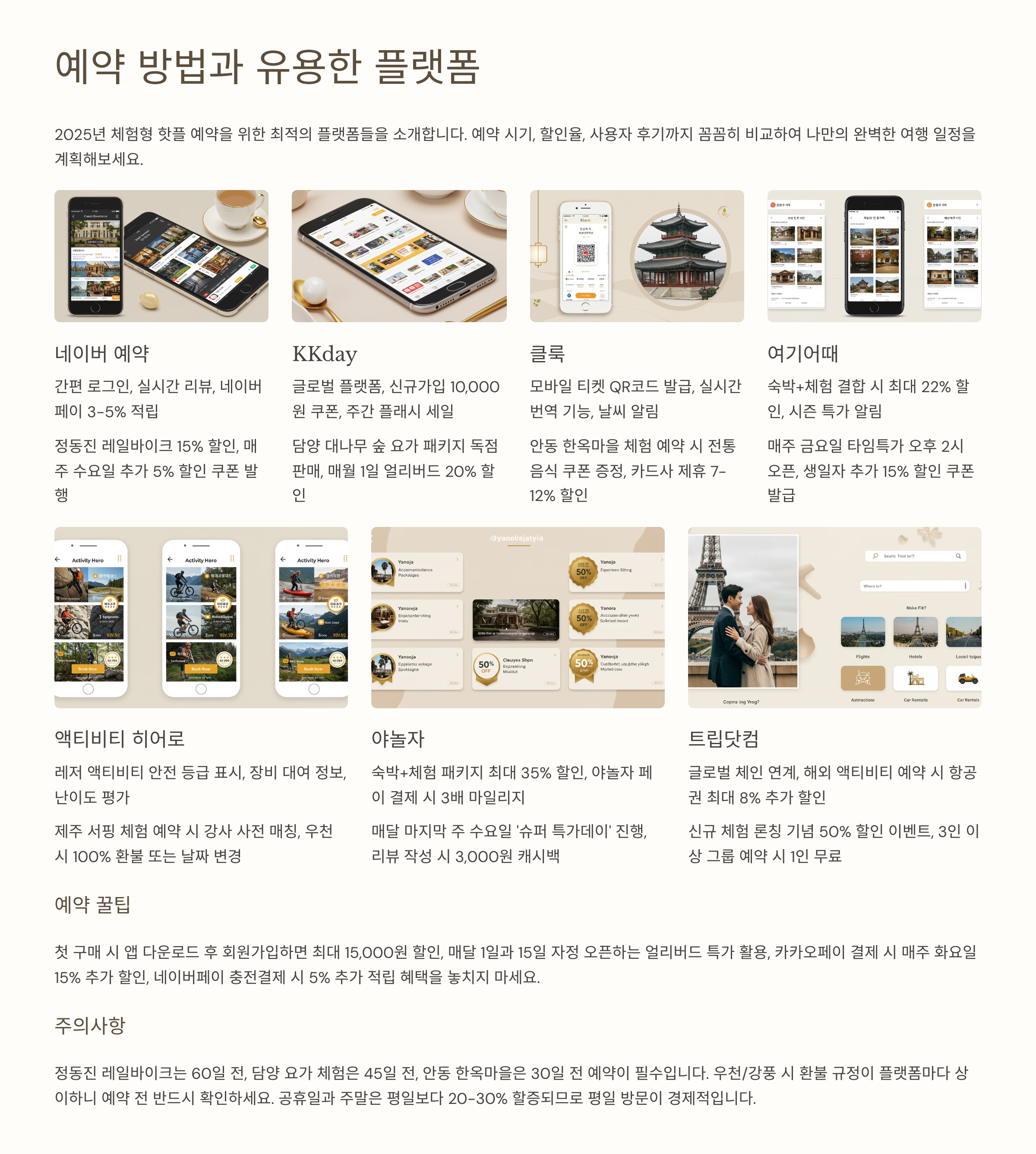 대부분의 체험형 관광지는 온라인 사전 예약이 필수입니다. 요즘 많이 사용하는 플랫폼은 '네이버 예약', 'KKday', '클룩(KLOOK)', 그리고 '여기 어때 체험'입니다. 아래는 플랫폼별 특징을 정리한 표입니다.