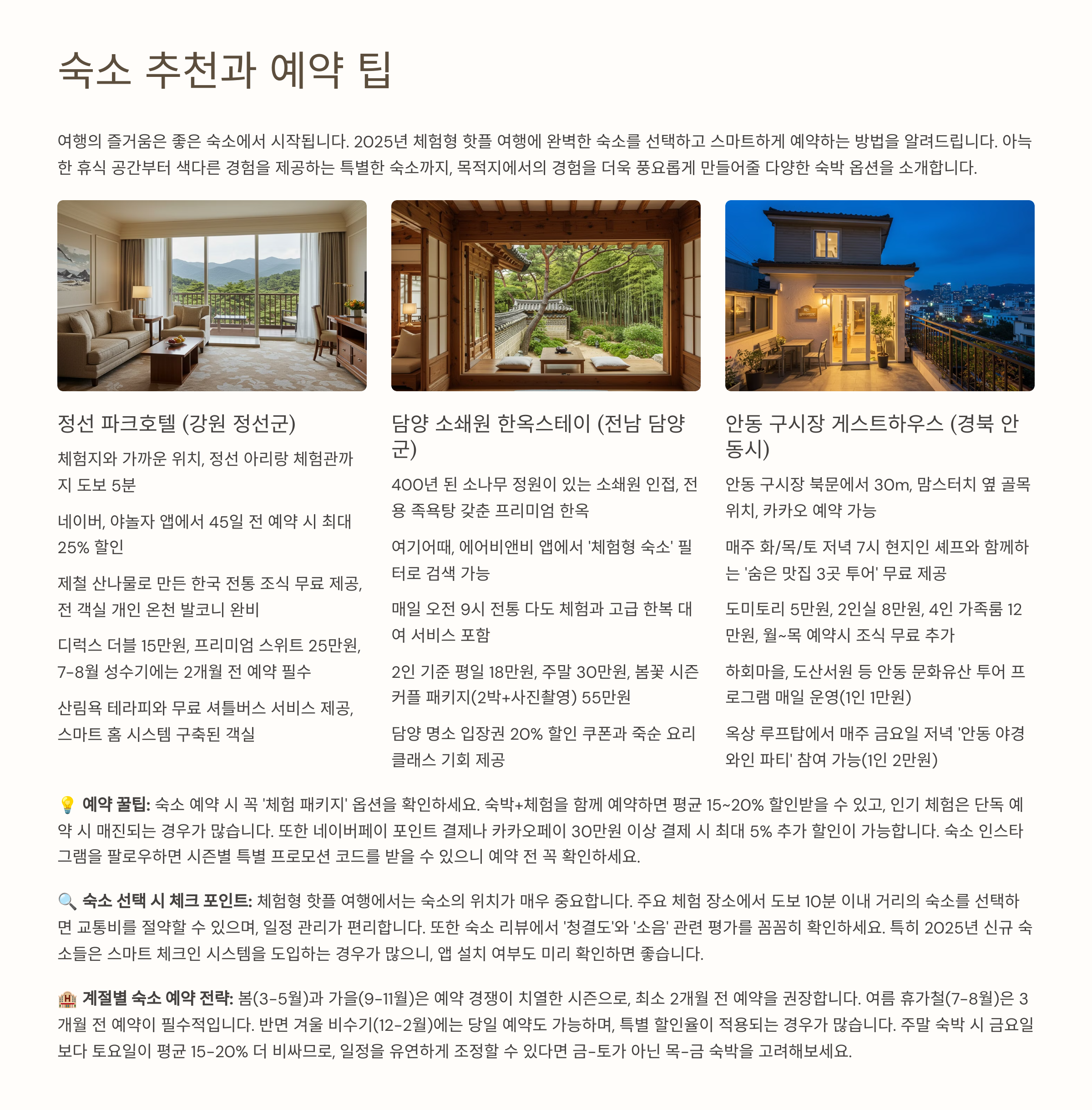 체험 중심 여행은 숙소의 위치와 분위기도 매우 중요합니다. 지역별 추천 숙소와 예약 팁을 아래 표로 정리해 보았습니다.