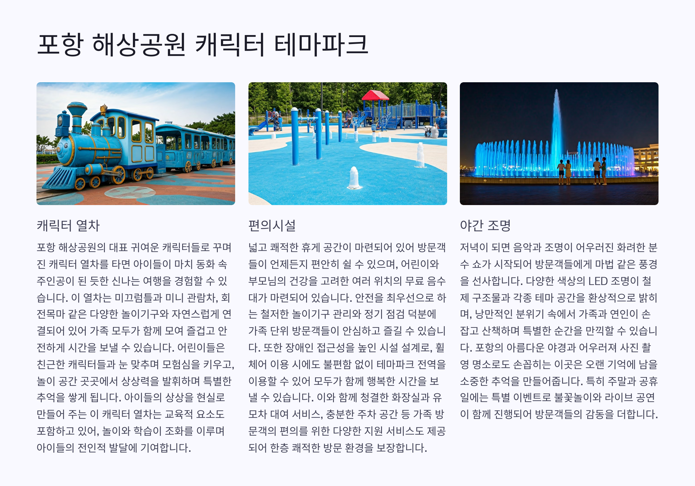 2025년 들어 새롭게 리뉴얼된 포항 해상공원 내 캐릭터 테마파크는 바다 위에 떠 있는 듯한 조형물과 놀이기구들로 아이들의 상상력을 자극하는 공간이에요.