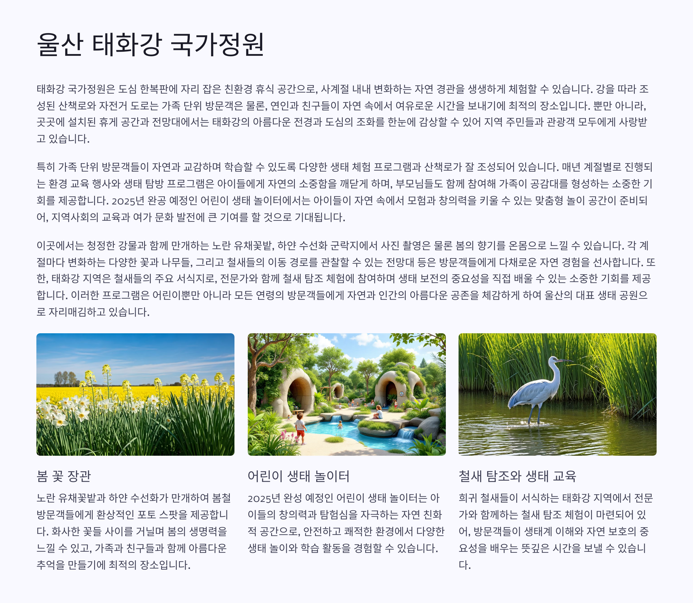 특히 봄에는 유채꽃과 수선화가 장관을 이루며, 2025년에는 새롭게 조성된 '어린이 생태 놀이터'가 추가되면서 아이들이 뛰놀기 더 좋아졌어요.