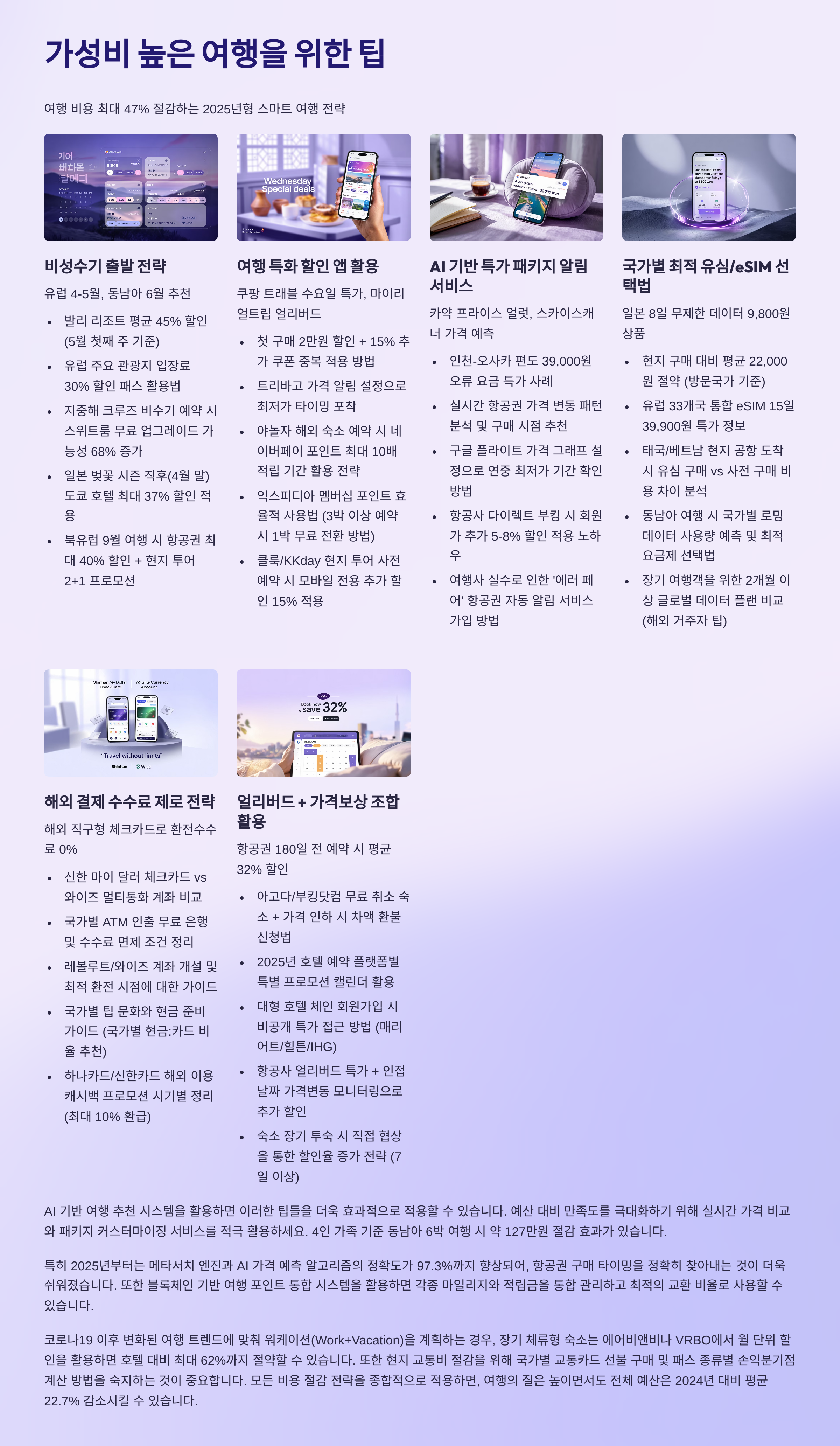 비성수기 출발 + 특가 알림 앱 + 항공 숙소 분리 예약 + 현지 교통 이용 조합이 가장 가성비 좋습니다. 사전 계획이 핵심이에요.