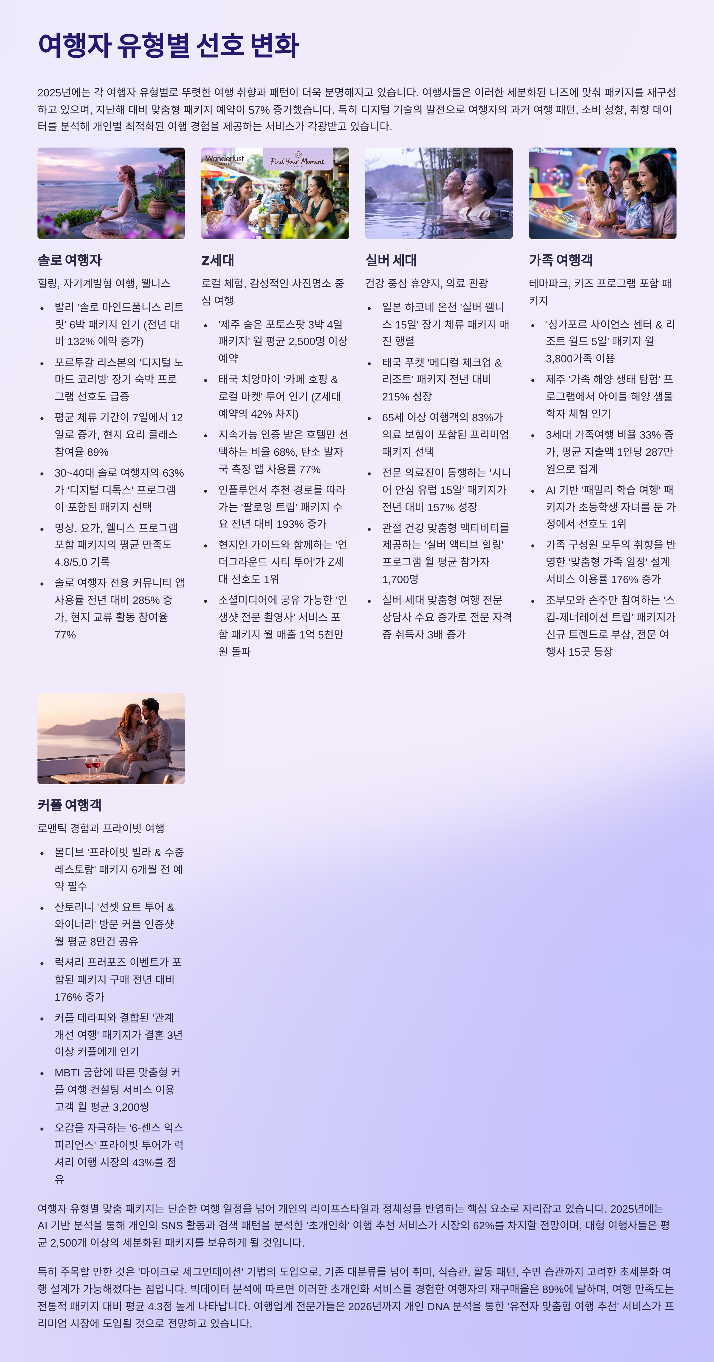 사람마다 여행에서 원하는 것이 다른 법이죠. 2025년에는 어떤 유형의 여행자들이 어떤 스타일을 선호하는지 한눈에 정리해봤어요.