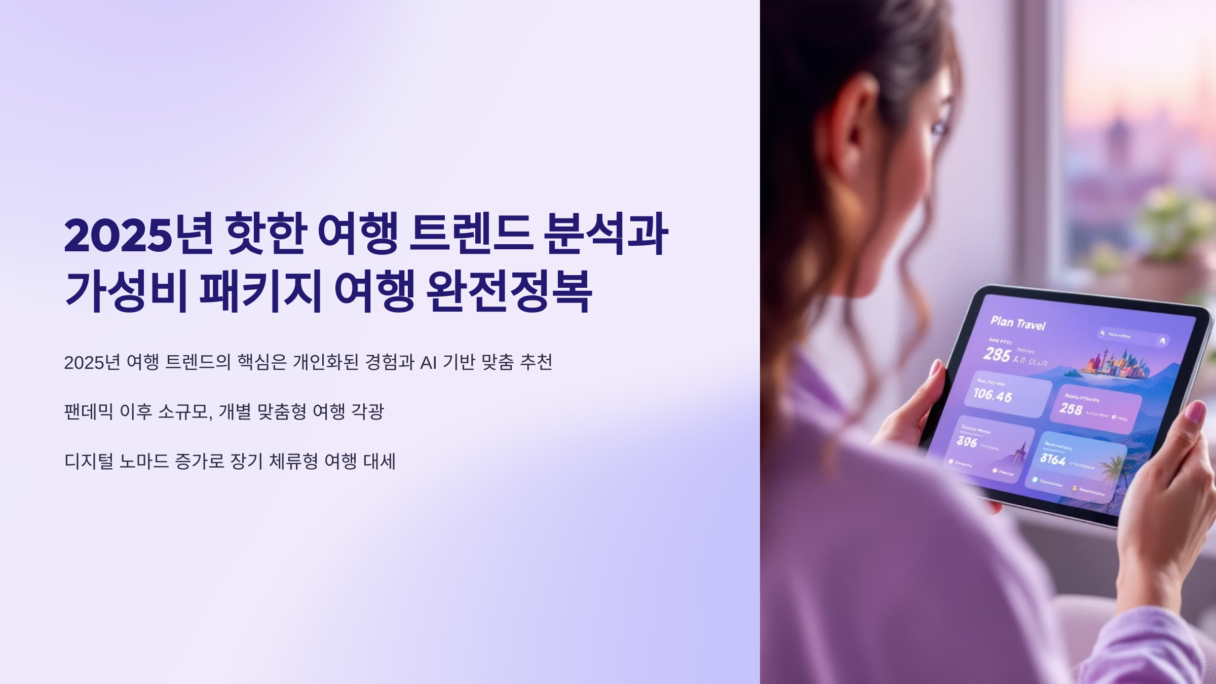 2025년, 어디로 떠날지 고민되시죠? AI가 추천하는 최신 여행 트렌드와 가성비 넘치는 패키지 여행 꿀팁을 지금 바로 확인해보세요.