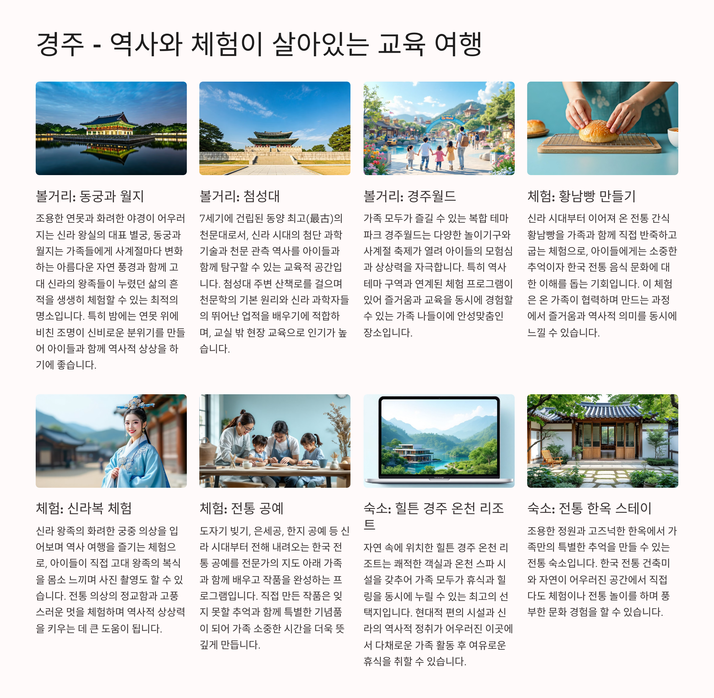 - 체험: 황남빵 만들기, 신라복 체험, 전통 공예 교실