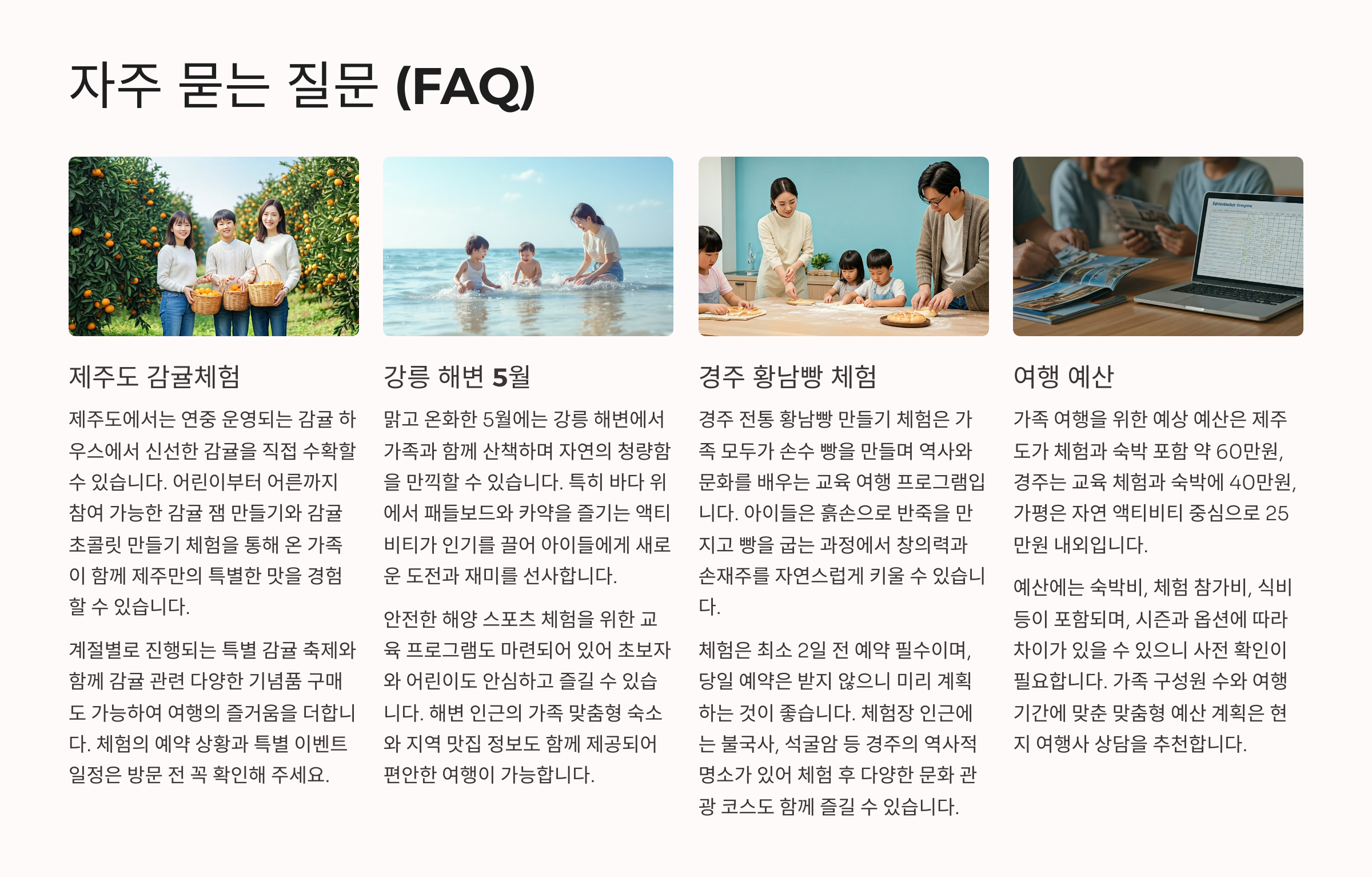 A6. 2박 3일 기준으로 제주도는 약 50~60만 원, 경주는 약 40만 원, 가평은 약 25만 원 정도로 예상하시면 됩니다. (교통+숙박+식사+체험 포함)