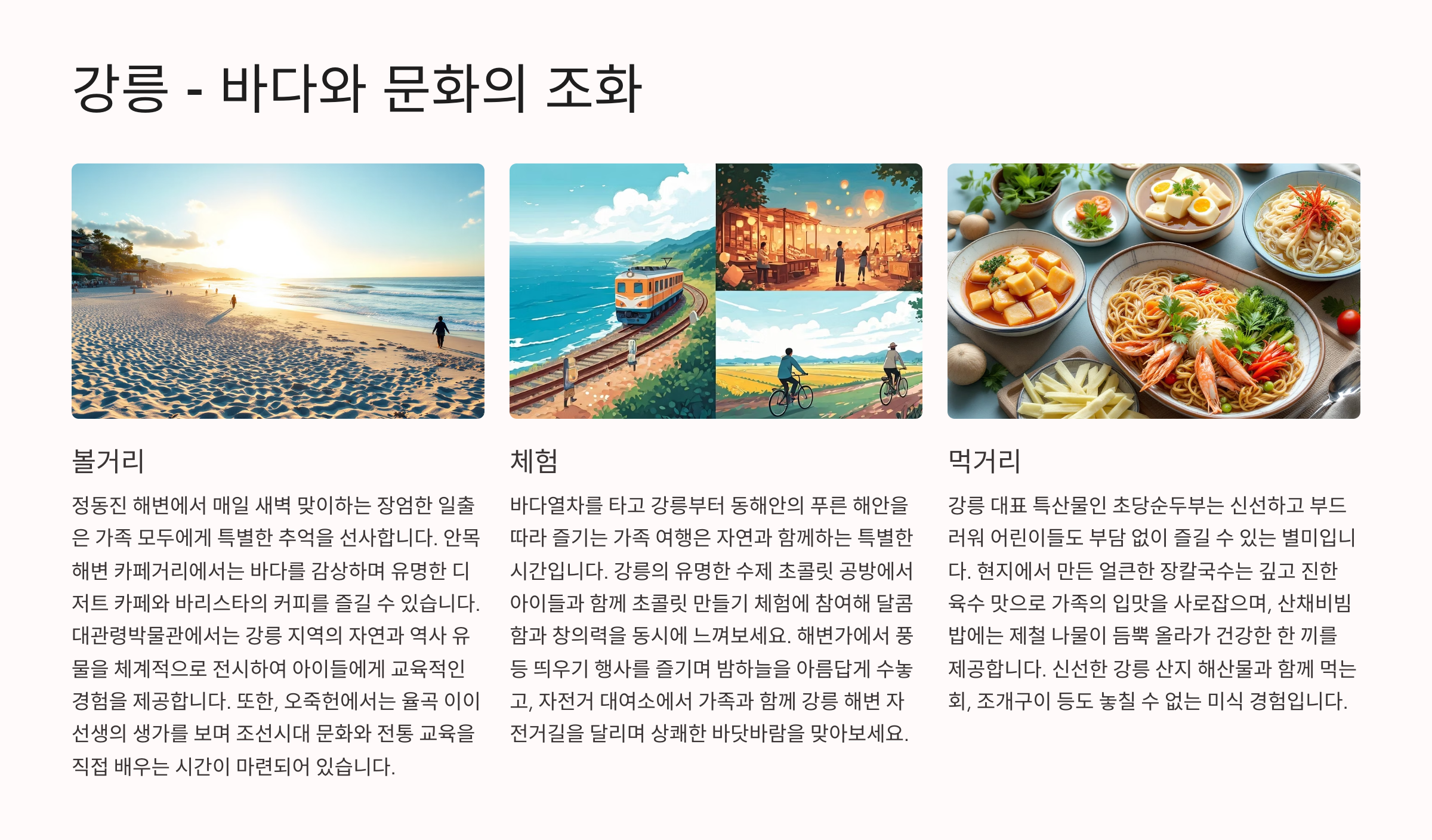 - 볼거리: 정동진 해변, 안목 해변 카페거리, 강릉 대관령박물관