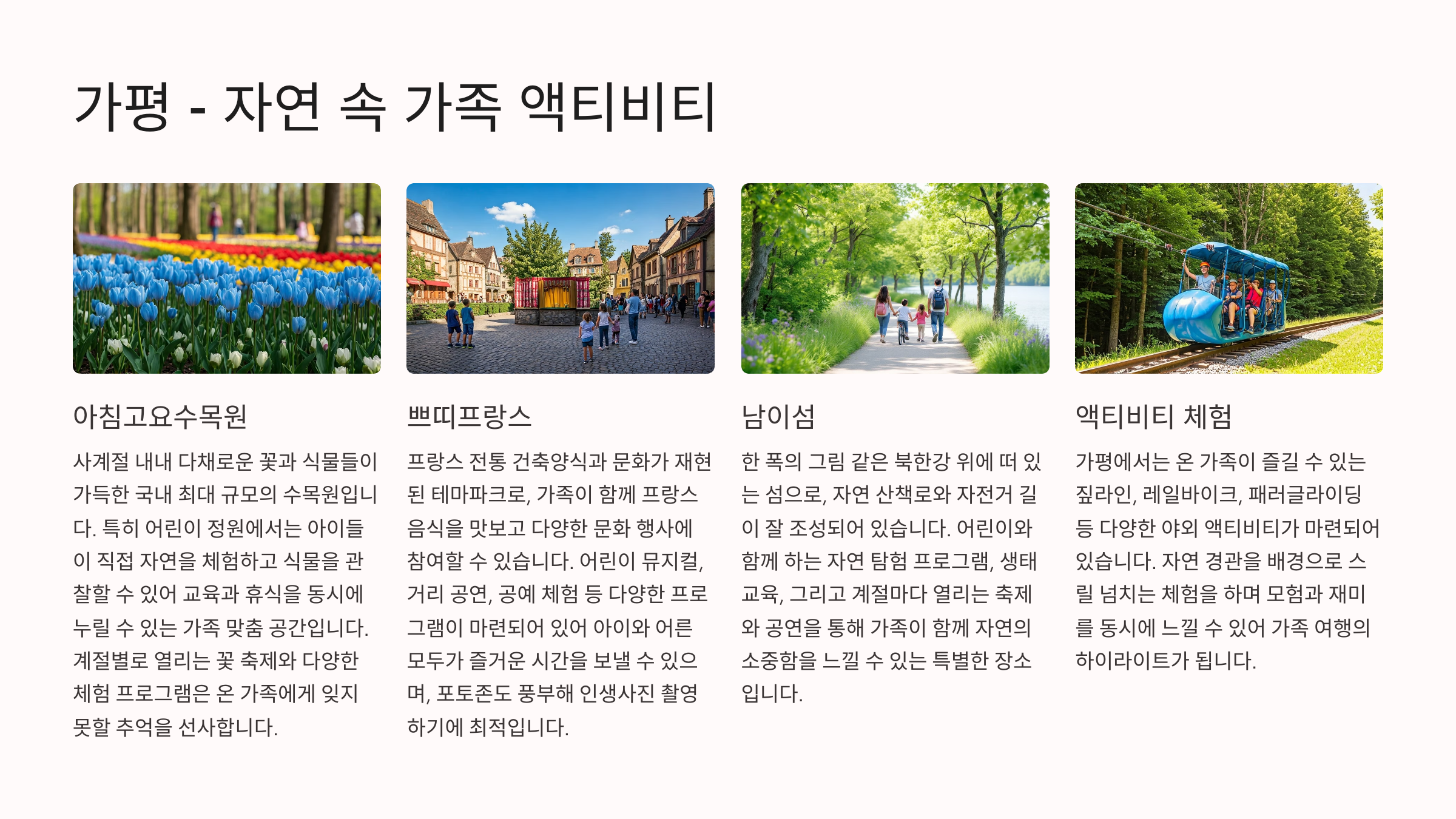 - 볼거리: 아침고요수목원, 쁘띠프랑스, 남이섬