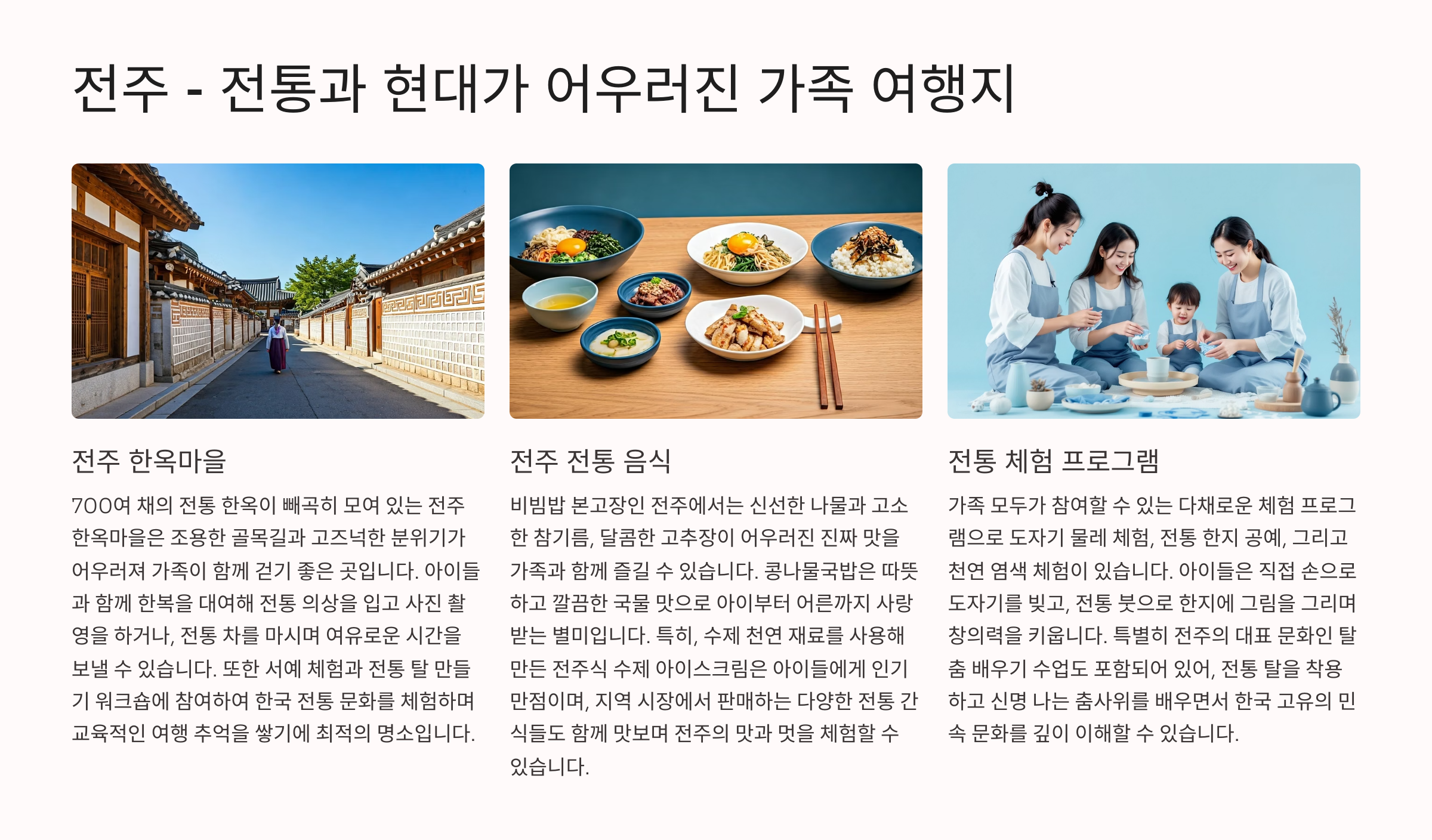 - 볼거리: 한옥마을, 경기전, 전주 동물원