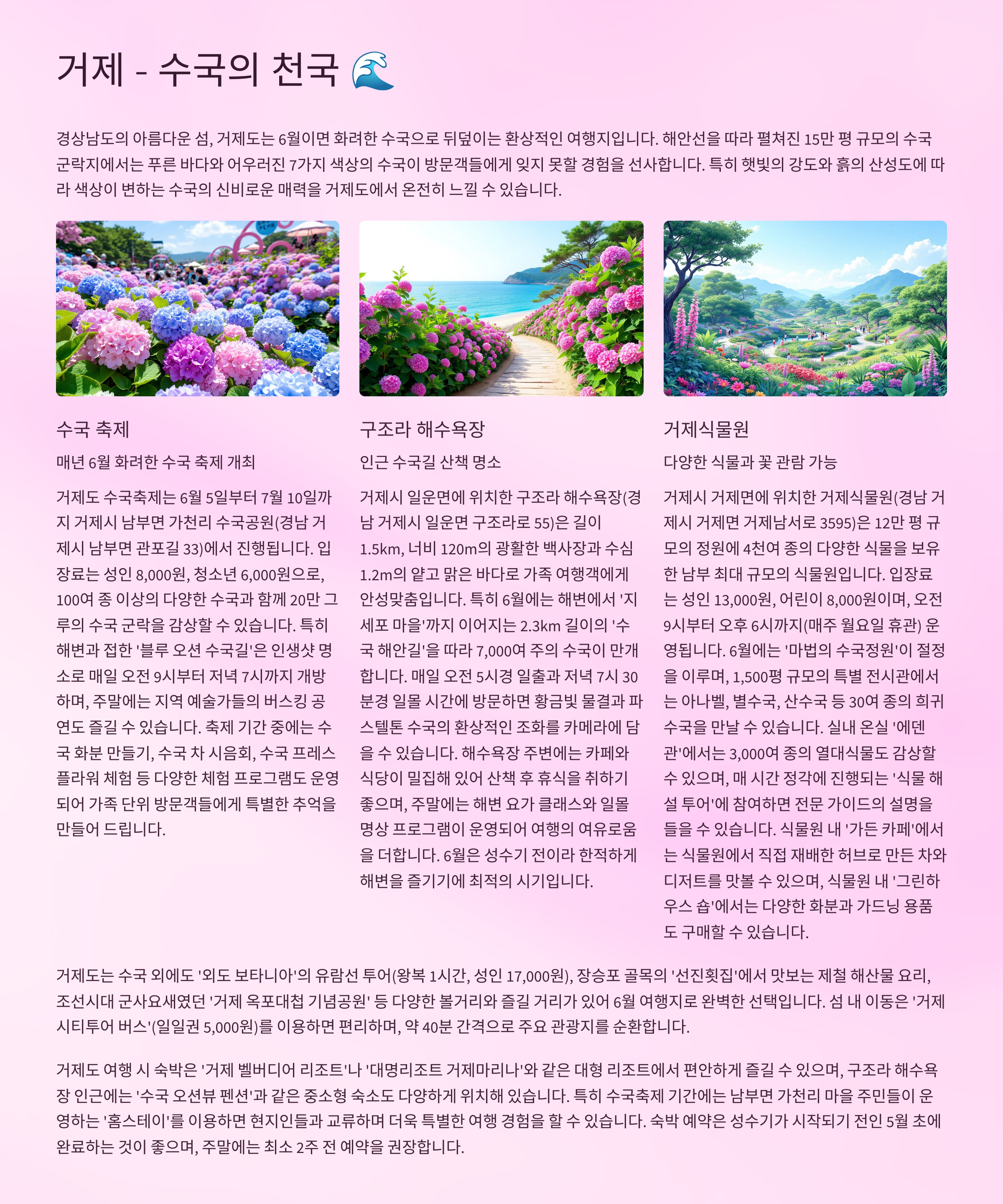경남 거제는 매년 6월 수국 축제로 유명한 지역입니다.
