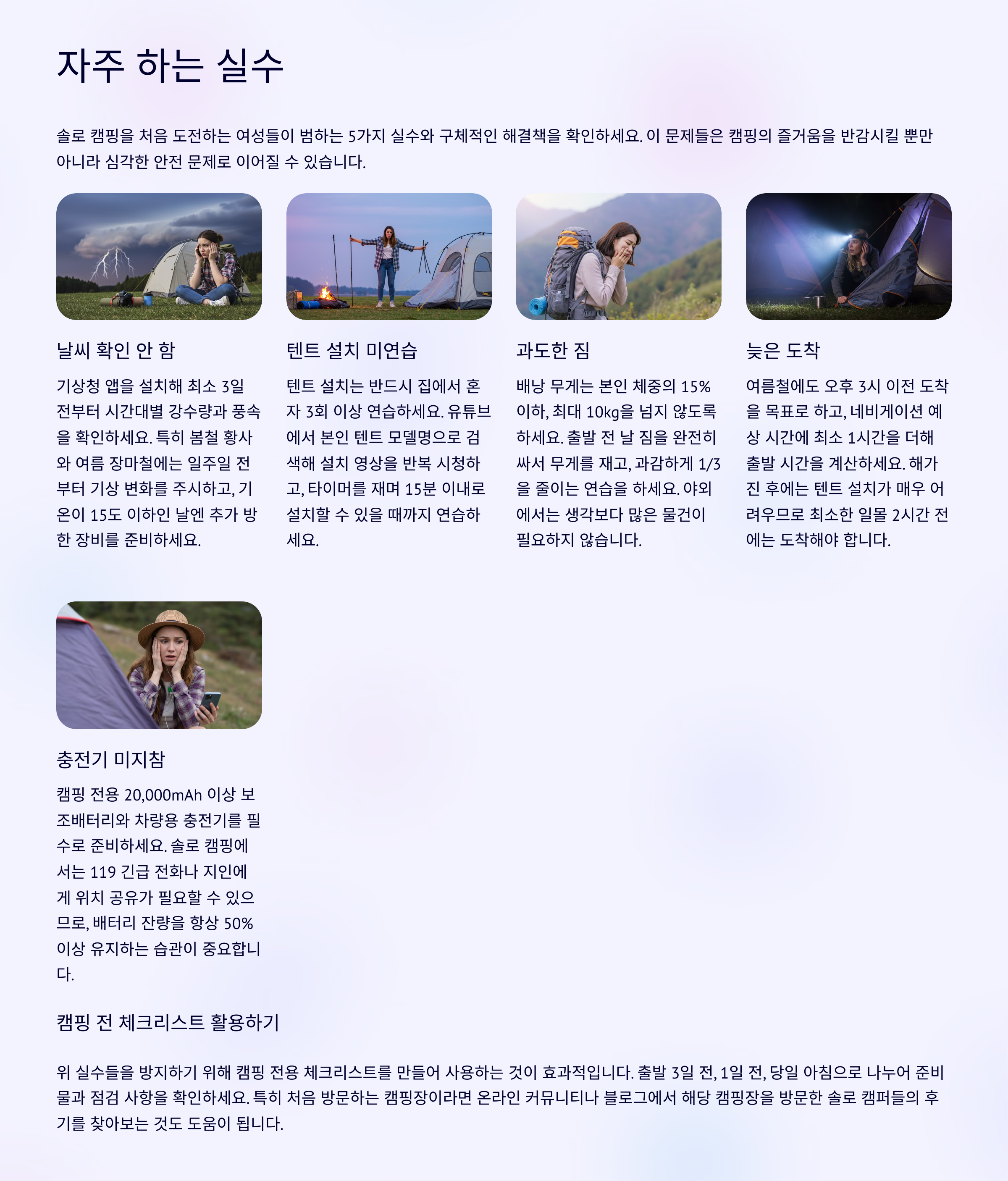 처음 캠핑을 시작할 때 흔히 하는 실수들이 있습니다. 미리 알아두면 훨씬 편안하고 안전한 캠핑이 될 수 있어요.