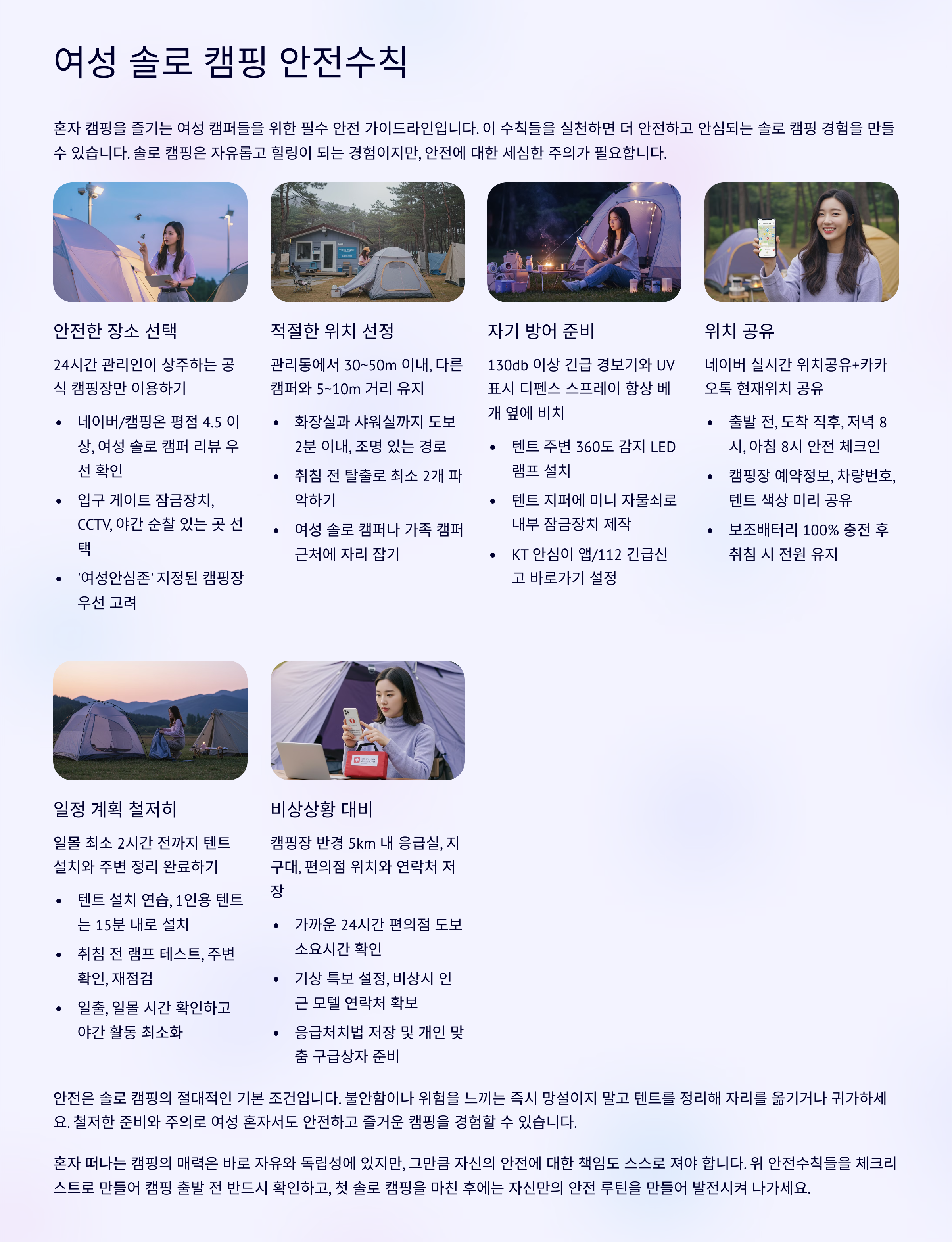 여성 혼자 떠나는 캠핑에서는 '안전'이 최우선입니다. 낯선 환경에서의 위협을 최소화하고, 예상치 못한 상황에서도 침착하게 대응할 수 있도록 몇 가지 수칙을 꼭 기억해 주세요.