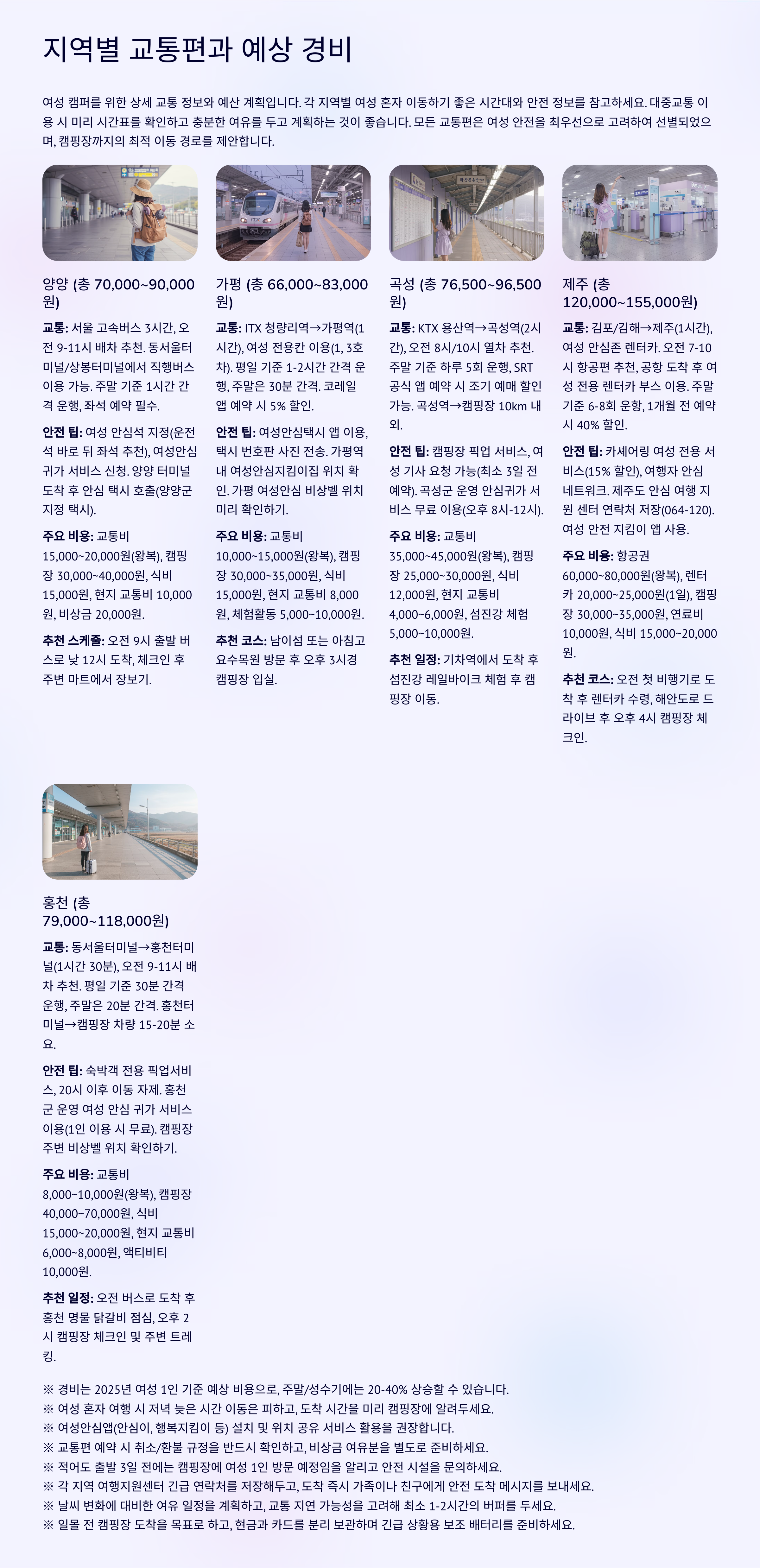 교통 접근성과 예상 경비는 캠핑 계획의 핵심 요소입니다. 지역별로 가장 많이 찾는 캠핑장 5곳에 대한 대중교통, 자가용 접근성, 숙박+식비 포함 하루 예상 경비를 정리했어요.