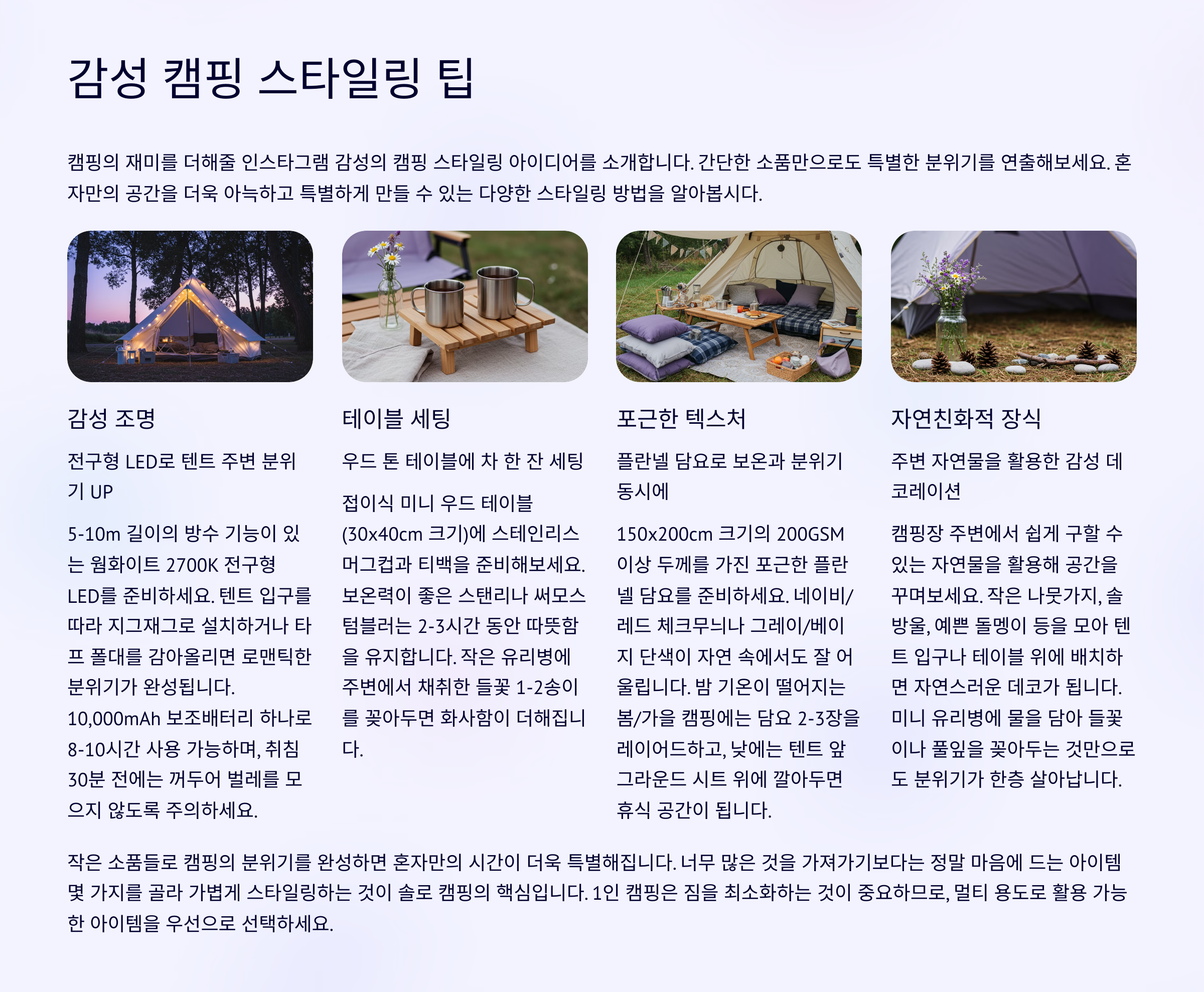 혼자 떠나는 캠핑이라도 분위기는 놓칠 수 없죠. 인스타 감성 물씬 나는 스타일링 팁을 정리해 봤습니다. 특별한 장비가 없어도, 소소한 소품만으로도 충분히 감성적인 분위기를 연출할 수 있어요.