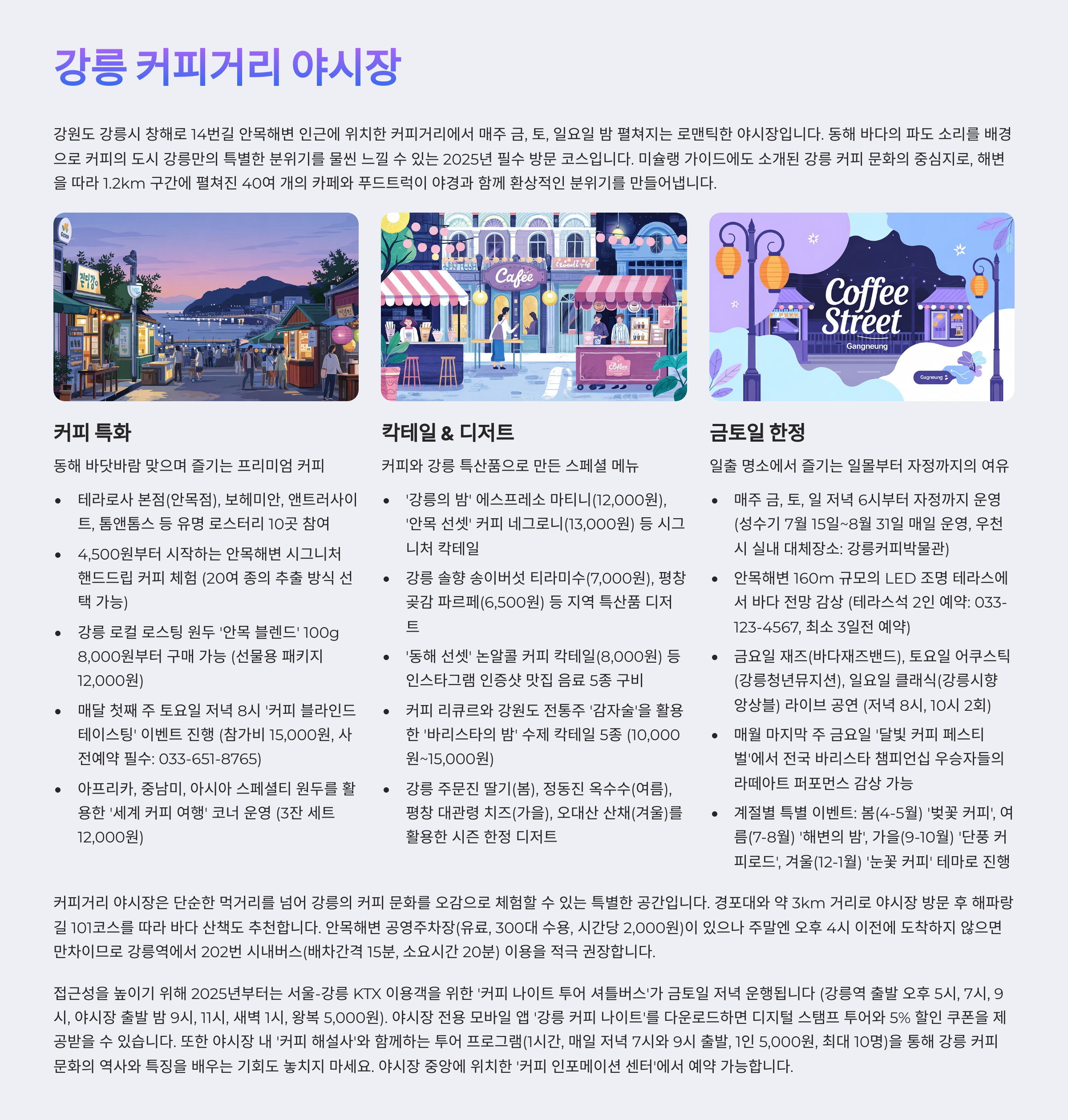 바닷바람 맞으며 커피 한 잔~ 강릉 커피거리는 원래도 유명한 곳이지만, 여름철 한정으로 열리는 야시장은 별미예요.