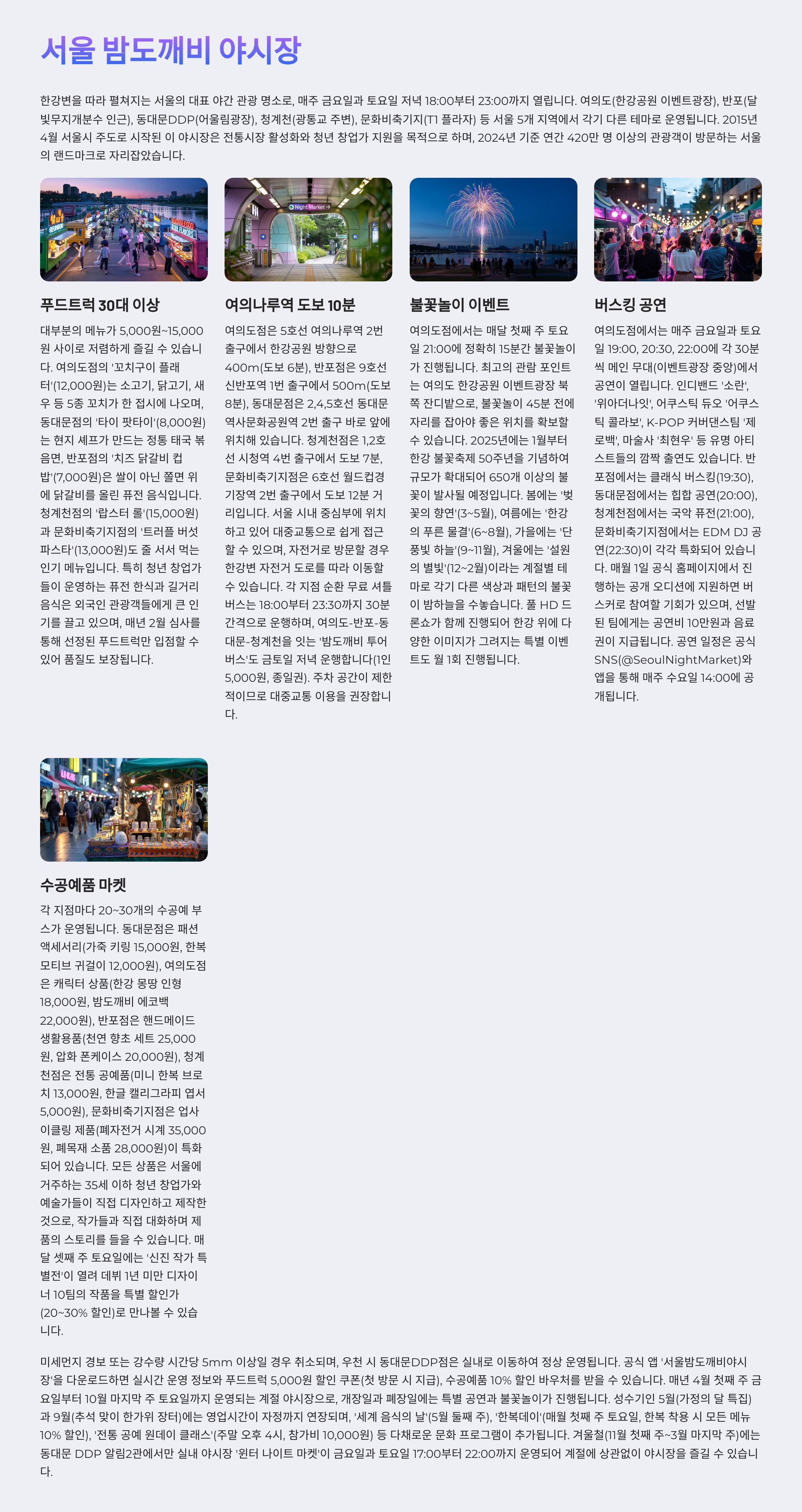 서울의 대표적인 야시장 중 하나로 한강 여의도 공원에서 열리는 ‘밤도깨비 야시장’은 이름처럼 금요일과 토요일 밤에만 깜짝 등장합니다. 푸드트럭이 30대 이상 즐비하게 서 있고, 글로벌 퓨전 음식부터 전통 분식까지 종류도 다양해요. 교통은 여의나루역에서 도보 10분 정도로 접근성 좋고, 가족 단위나 연인, 친구끼리 가볍게 나들이 겸 들르기 딱입니다. 불꽃놀이가 있는 날은 그야말로 환상적인 분위기!
