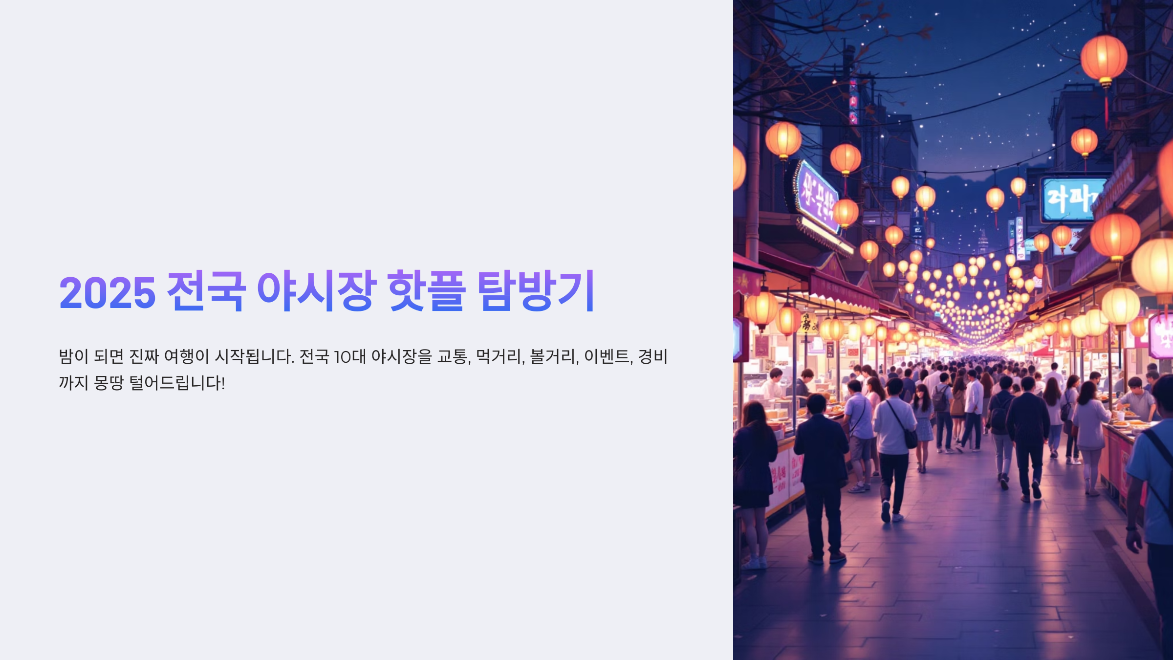 지금 가장 뜨거운 여행 트렌드? 단연코 전국 야시장 탐방이죠! 밤이 되면 진짜 여행이 시작됩니다.