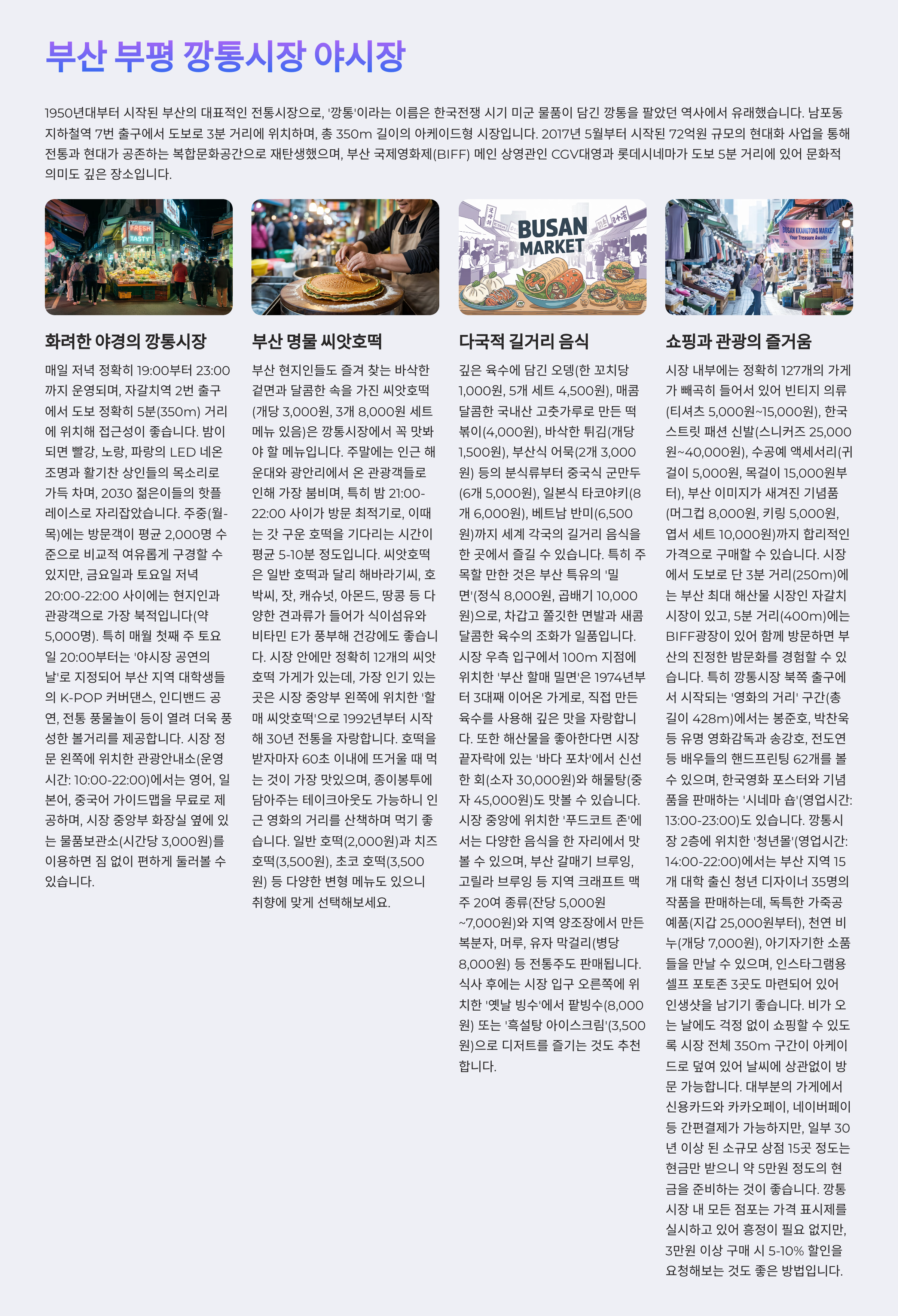 부산은 야시장 하면 당연히 깡통시장! 낮에는 전통시장, 밤에는 화려한 야시장으로 변신합니다.