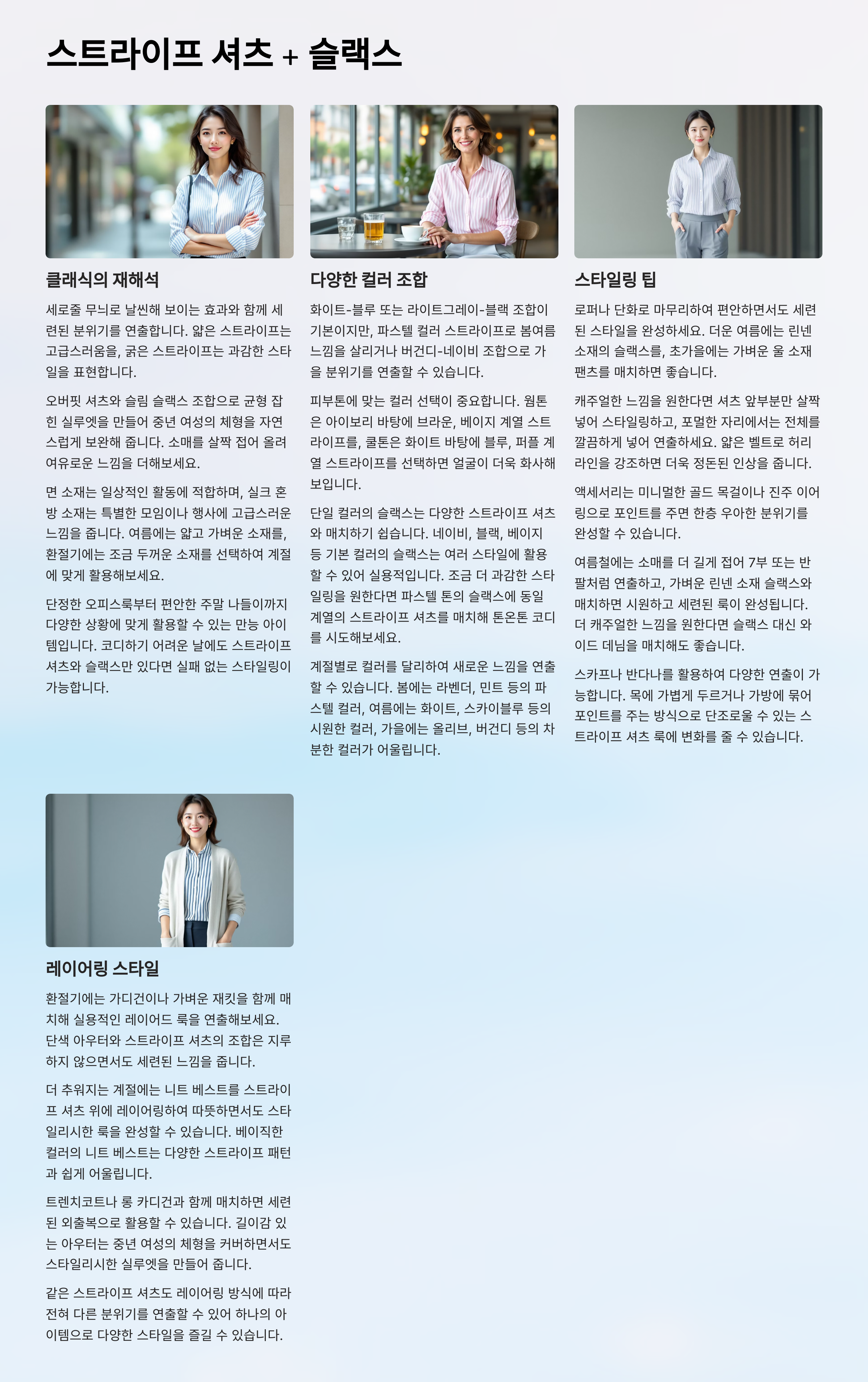 스트라이프 셔츠는 시대를 초월한 클래식 아이템입니다. 특히 세로줄 무늬는 체형을 보다 길고 날씬하게 보이게 해 주어 중년 여성에게 잘 어울립니다.