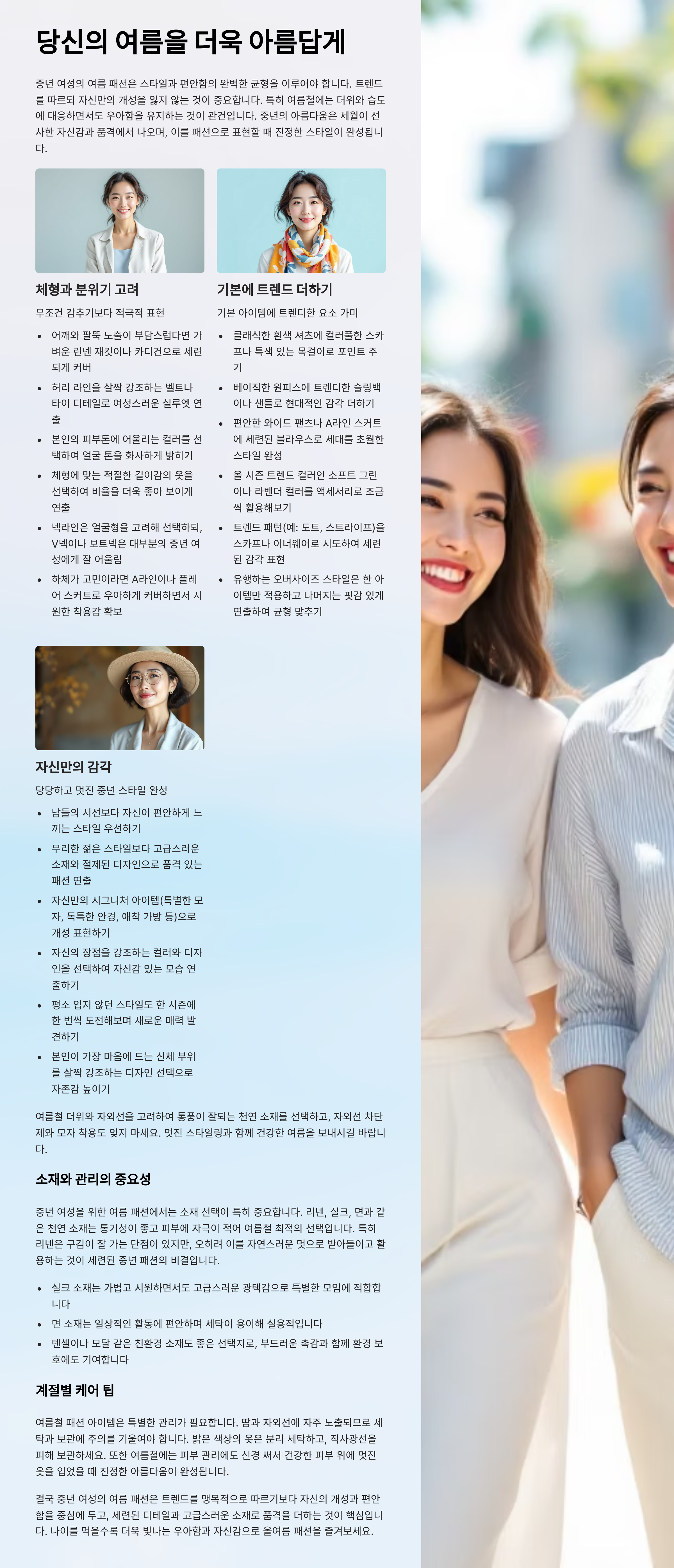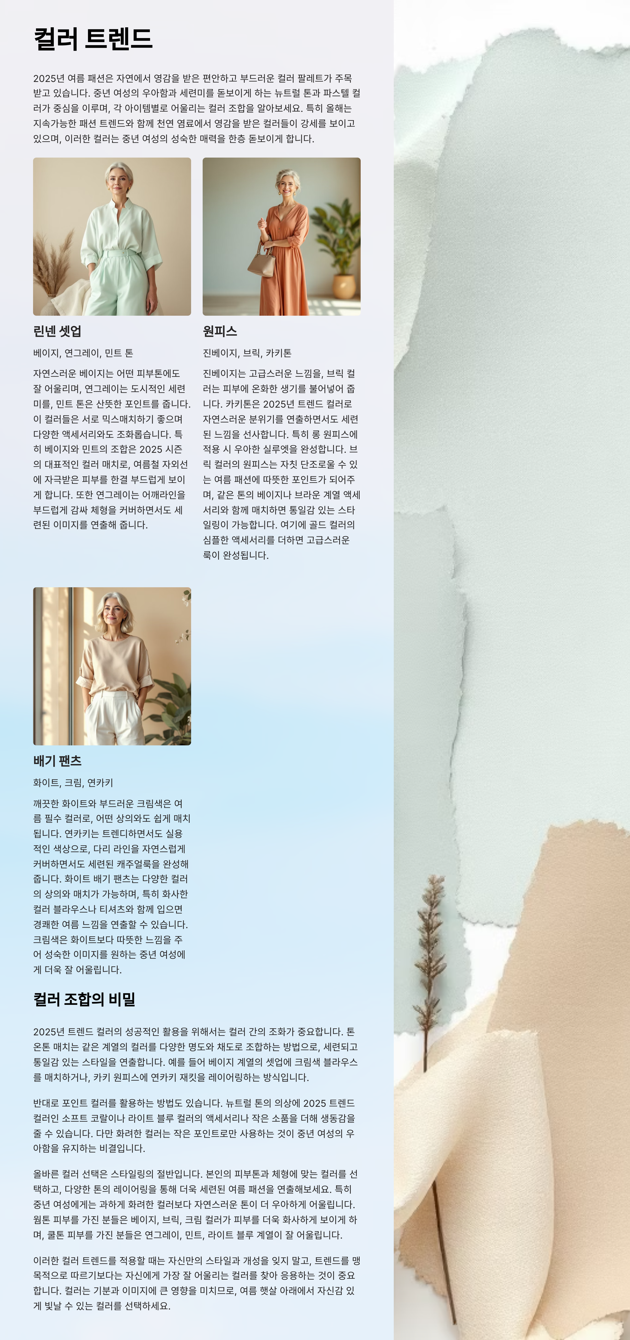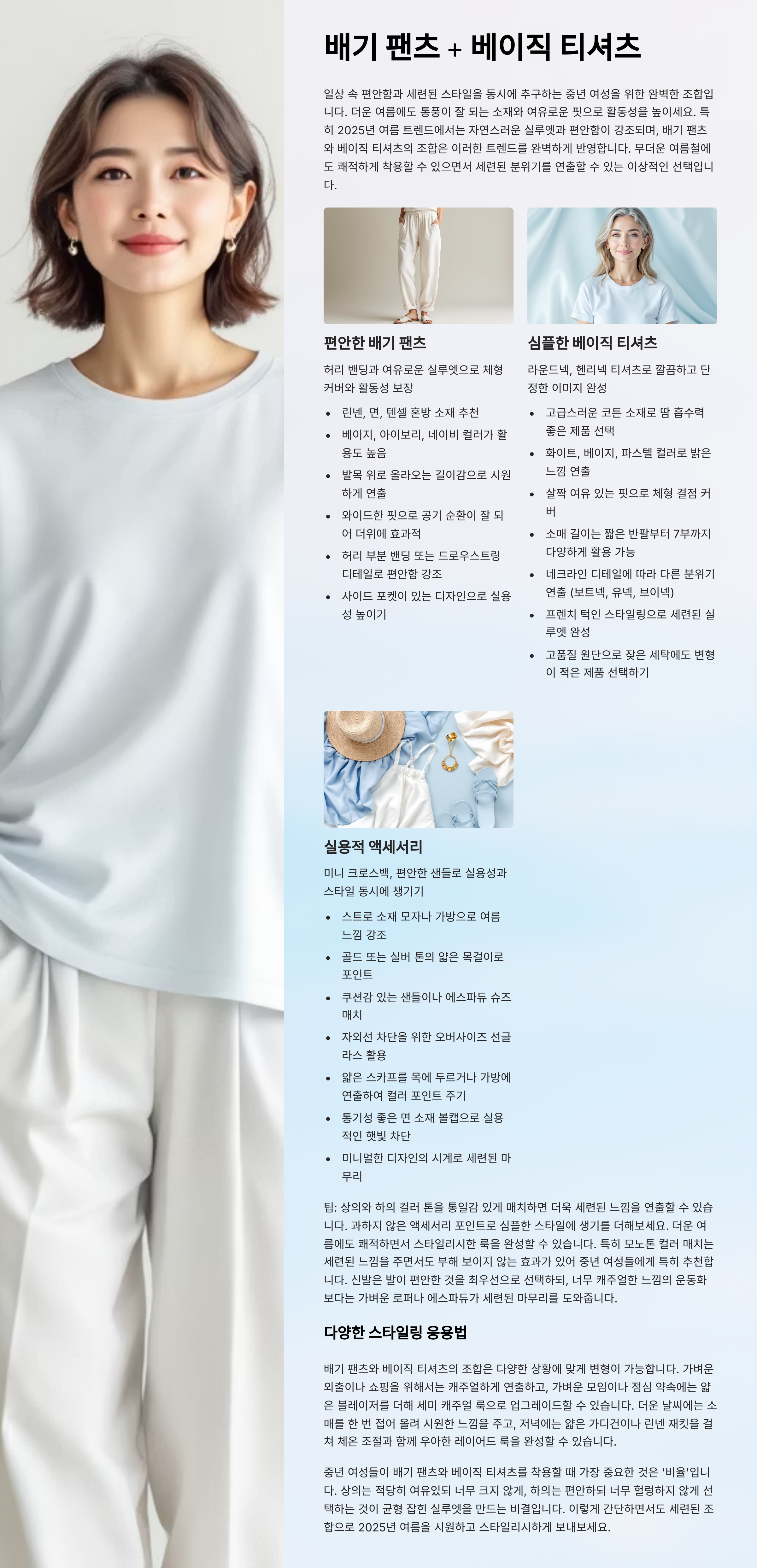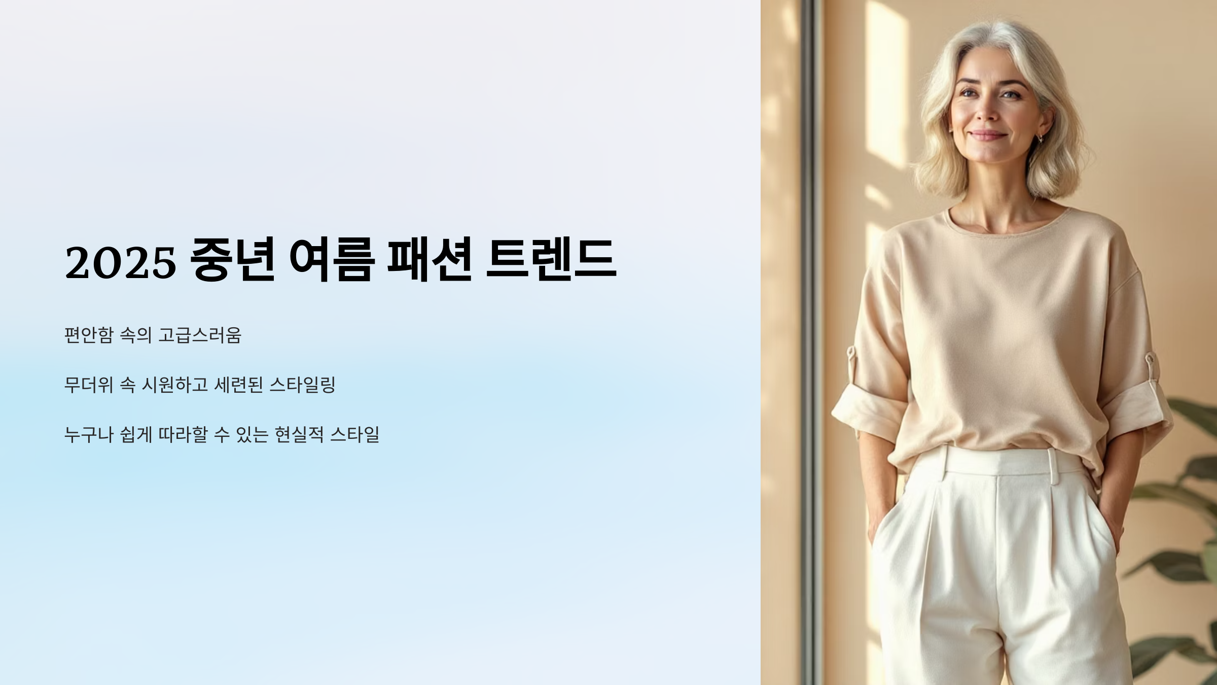 2025년 여름, 중년 여성 패션의 키워드는 ‘편안함 속의 고급스러움’입니다. 나이가 들수록 패션이 제한된다고 생각하는 분들도 많지만, 이제는 시대가 바뀌었습니다.