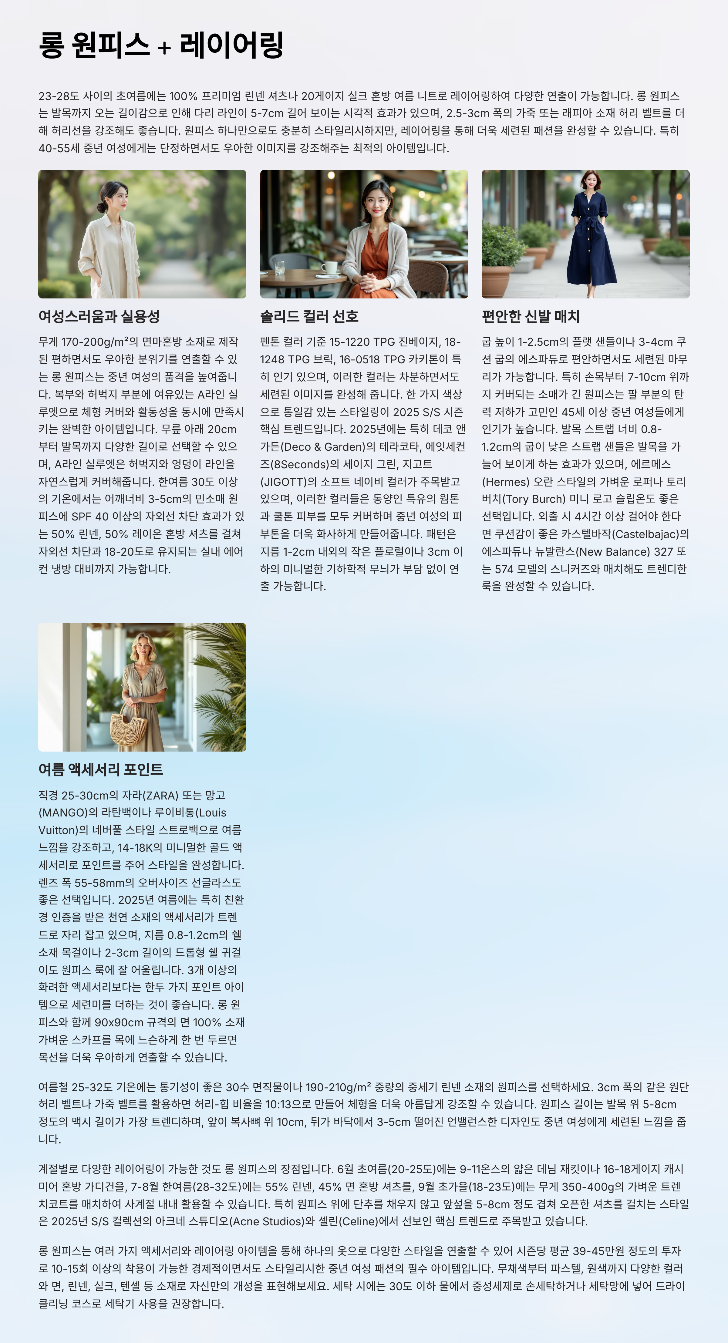 여기에 얇은 리넨 셔츠나 여름 니트를 걸쳐주면 자외선 차단 효과는 물론이고 스타일링의 완성도도 높아집니다. 심플한 원피스를 다양한 아이템과 매치해 레이어링 하는 방식이 중년 여성에게 실용적으로 다가오고 있습니다.