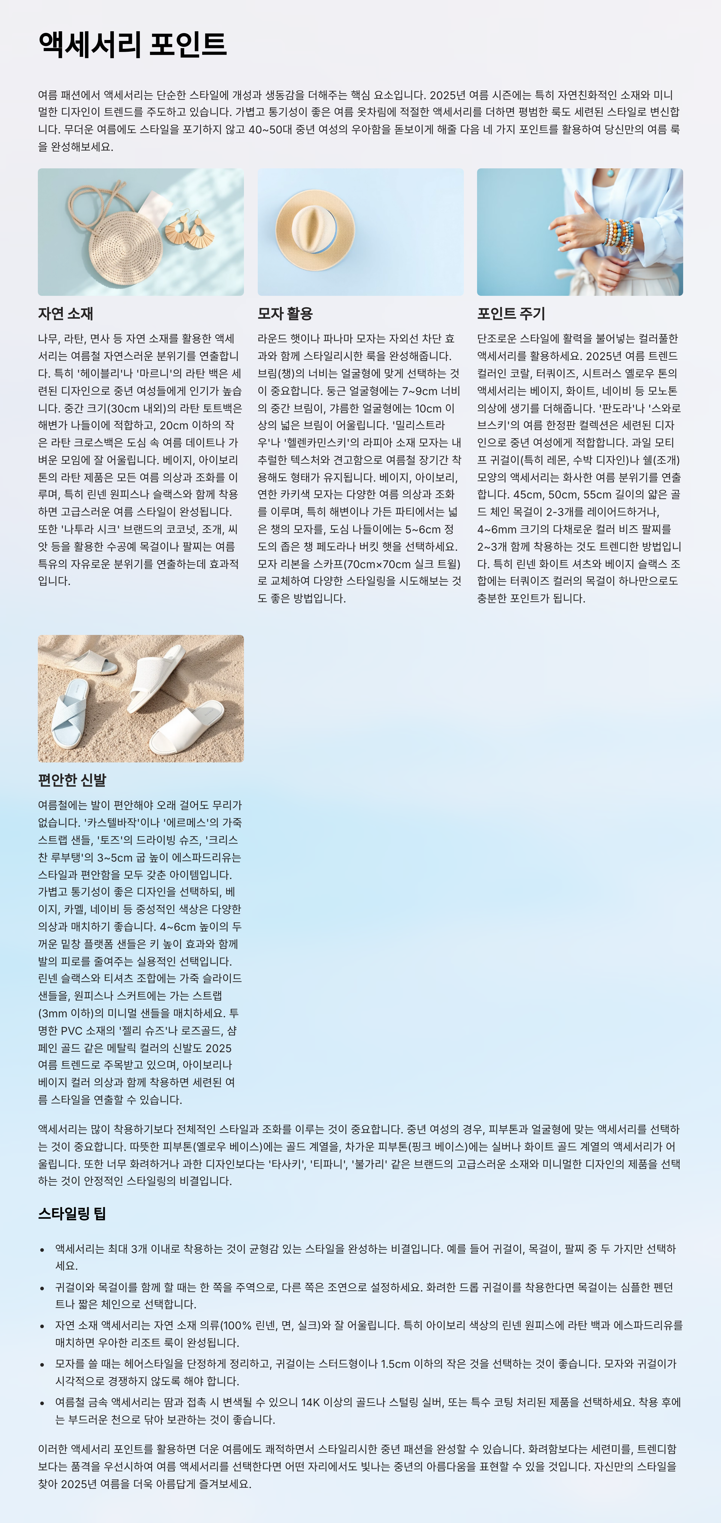기본 아이템일수록 디테일에서 승부가 갈립니다. 단조로운 스타일에 포인트를 줄 수 있는 방법은 바로 액세서리 활용이에요. 2025년 여름에는 자연 소재의 액세서리 – 나무, 라탄, 면사 등을 활용한 귀걸이, 팔찌, 가방이 큰 인기를 끌고 있습니다.