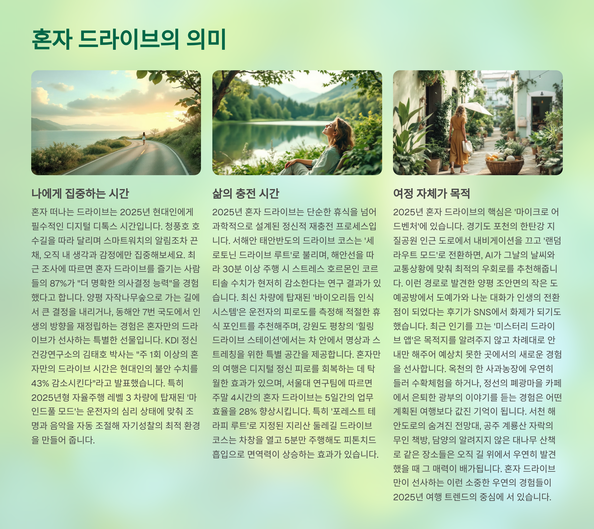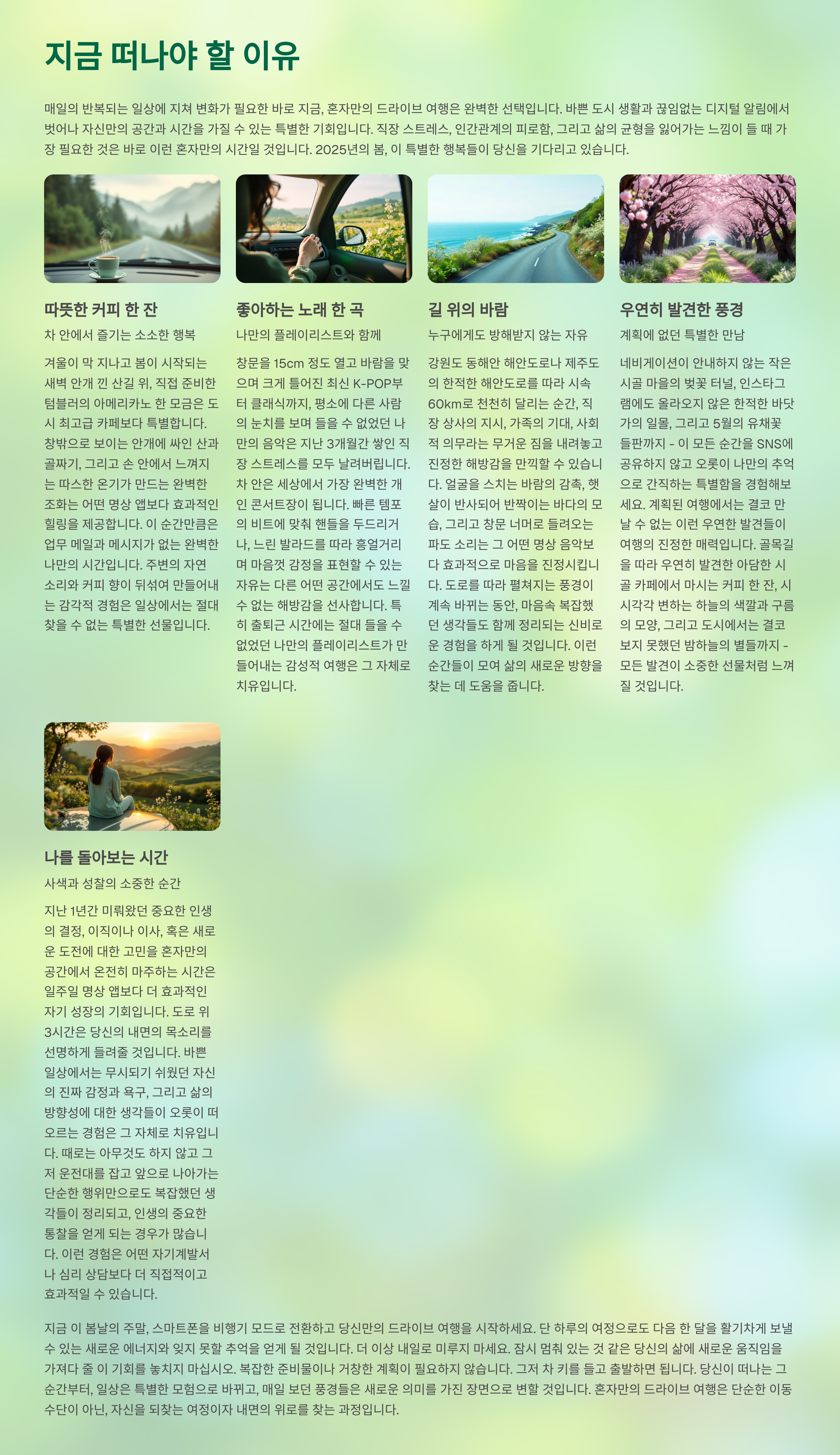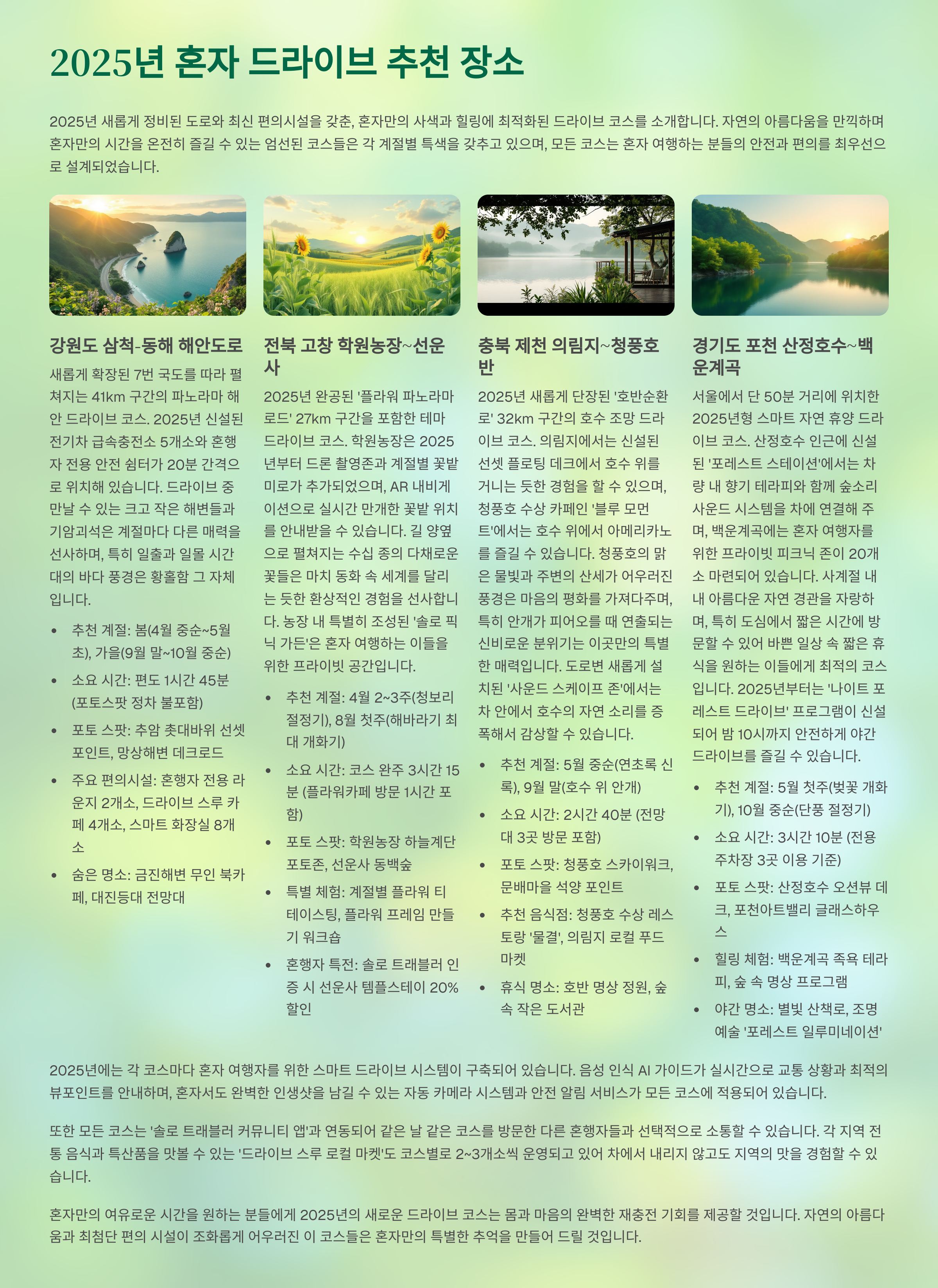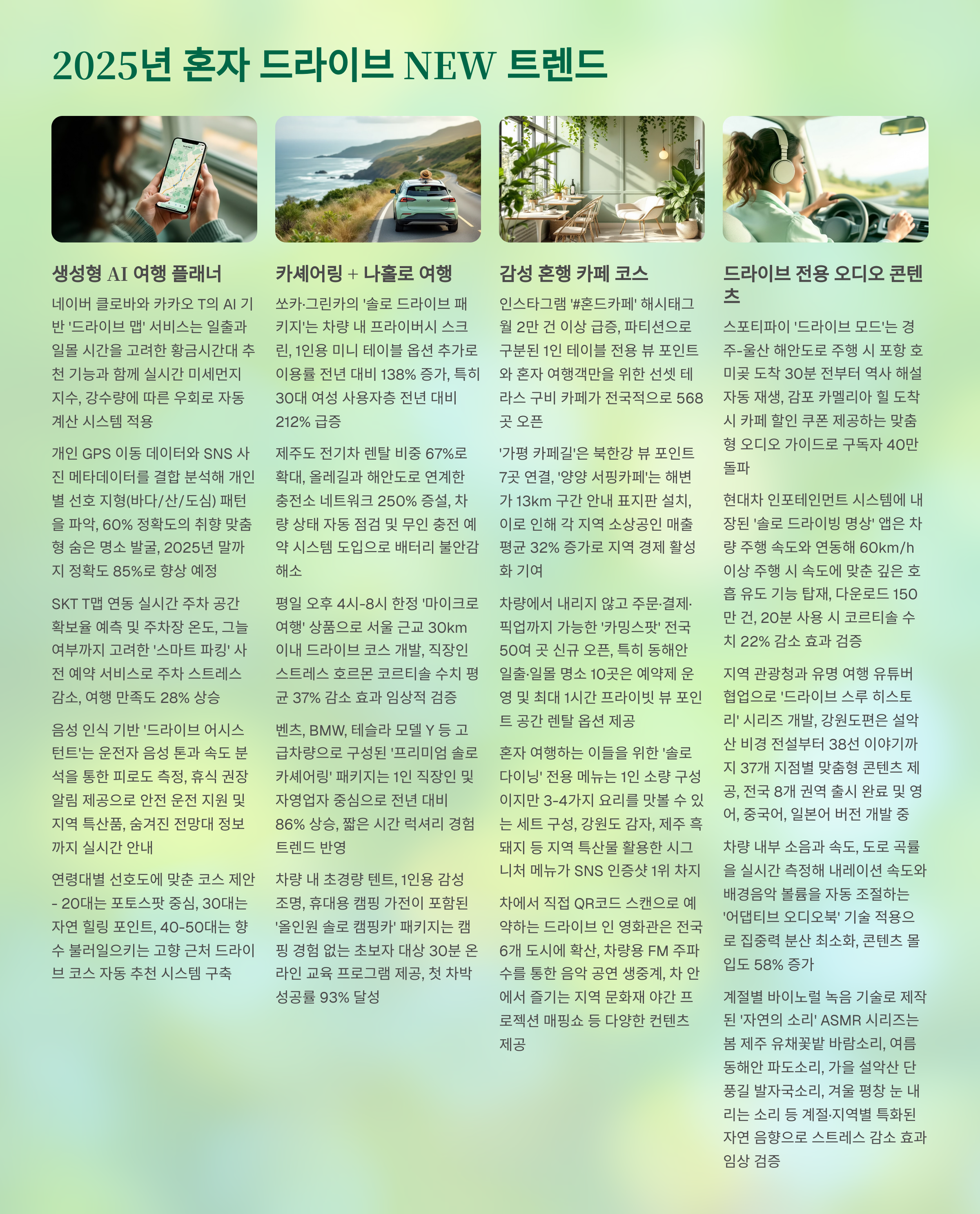 2025년 혼자 드라이브 여행은 단순한 이동이 아닌, AI와 플랫폼을 활용한 맞춤형 힐링 여정으로 진화했습니다.