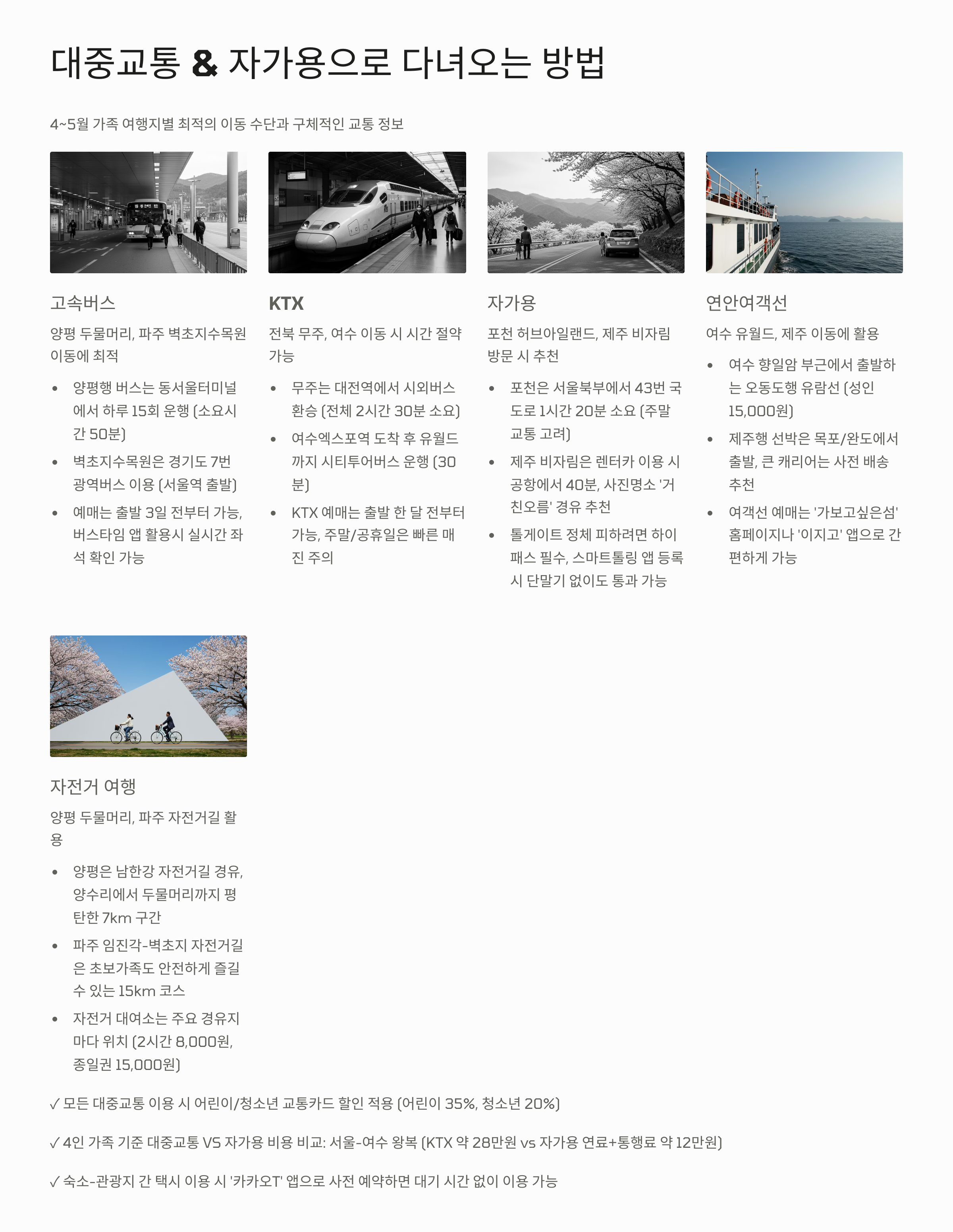 가족 단위 여행이라면 이동도 굉장히 중요하죠. 각 장소별 접근성과 교통편을 고려해 몇 가지 팁을 정리해 봤어요.